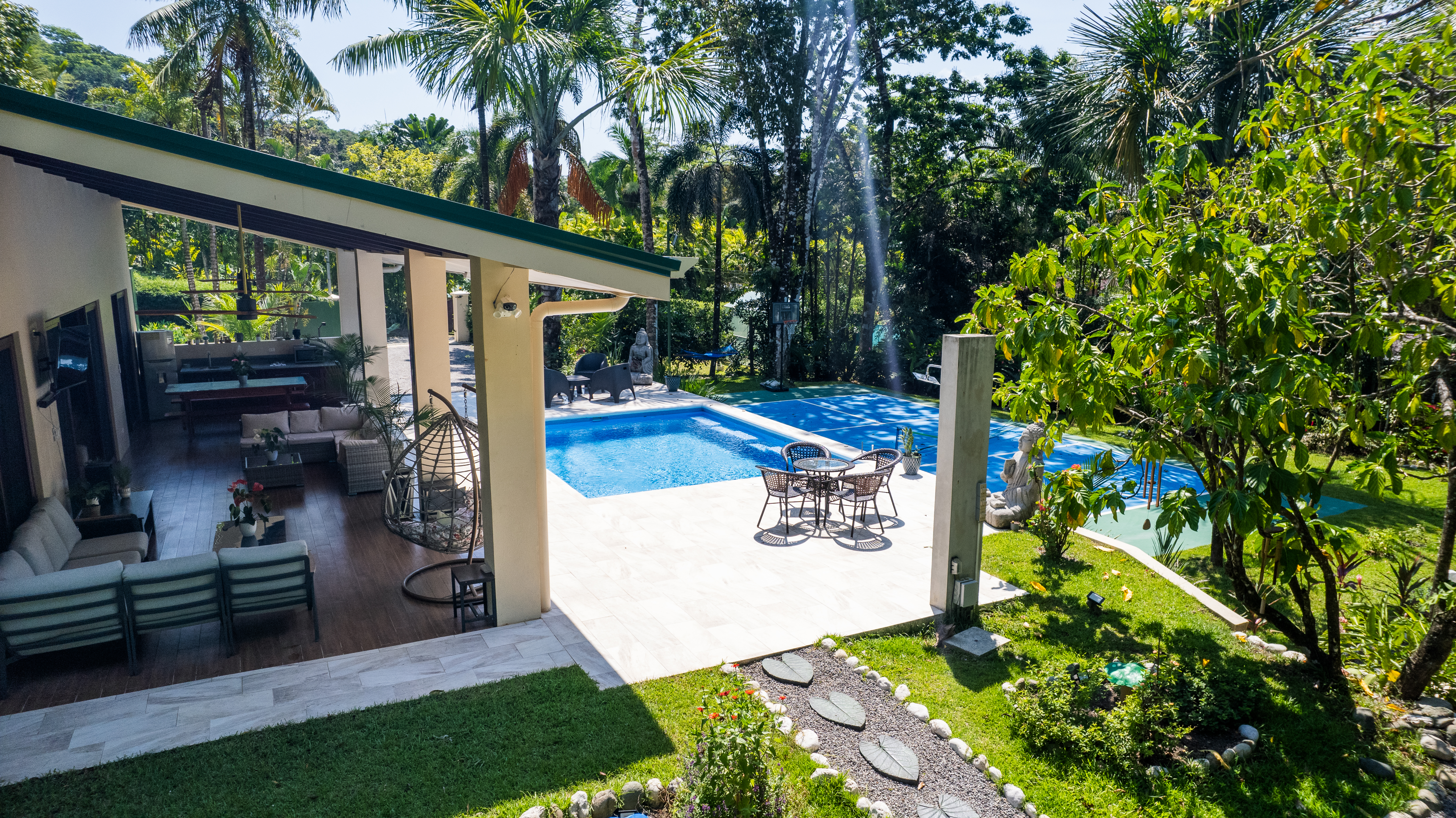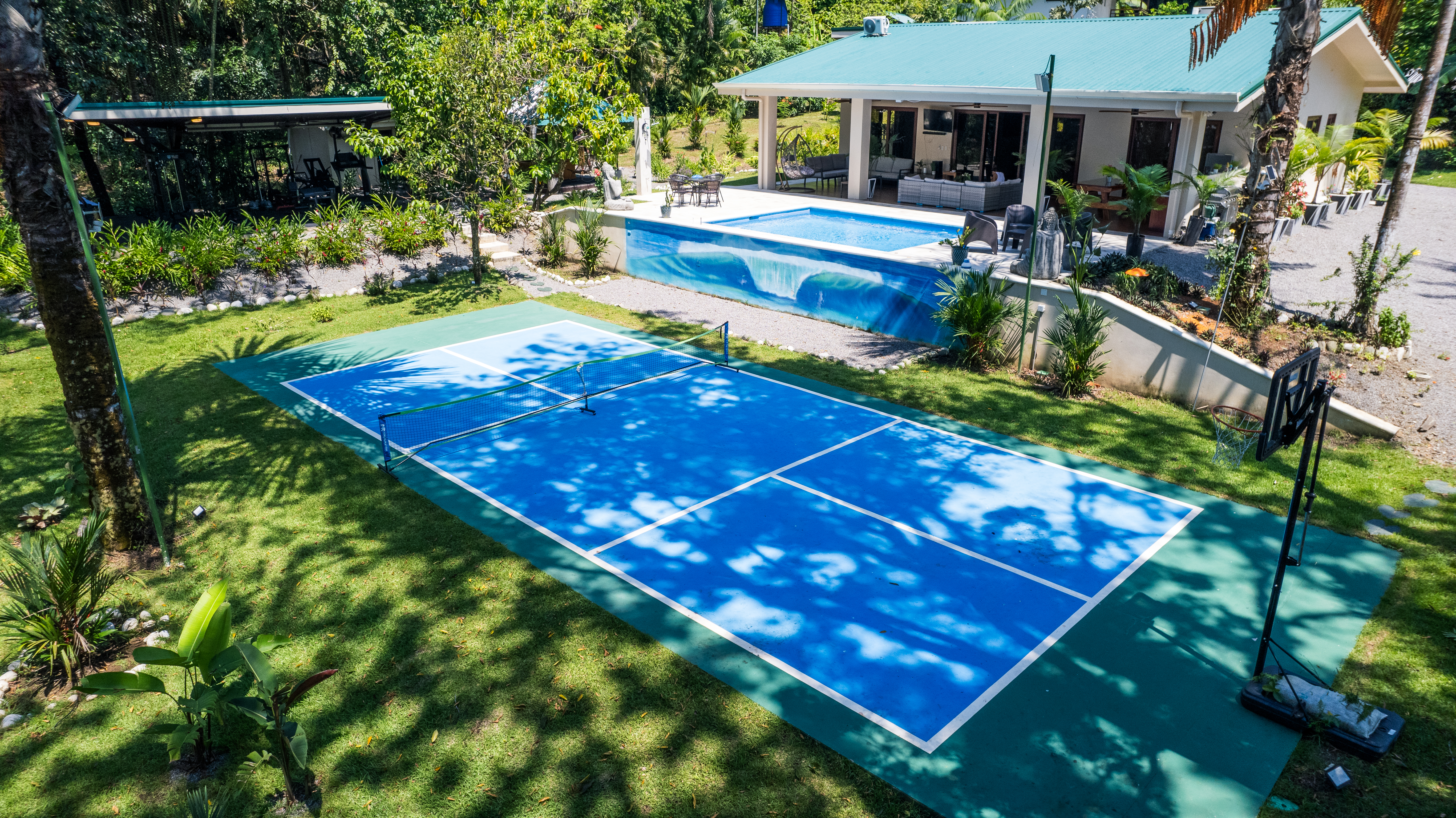 - Blue tennis court and swimming pool at Pavones Resort villa