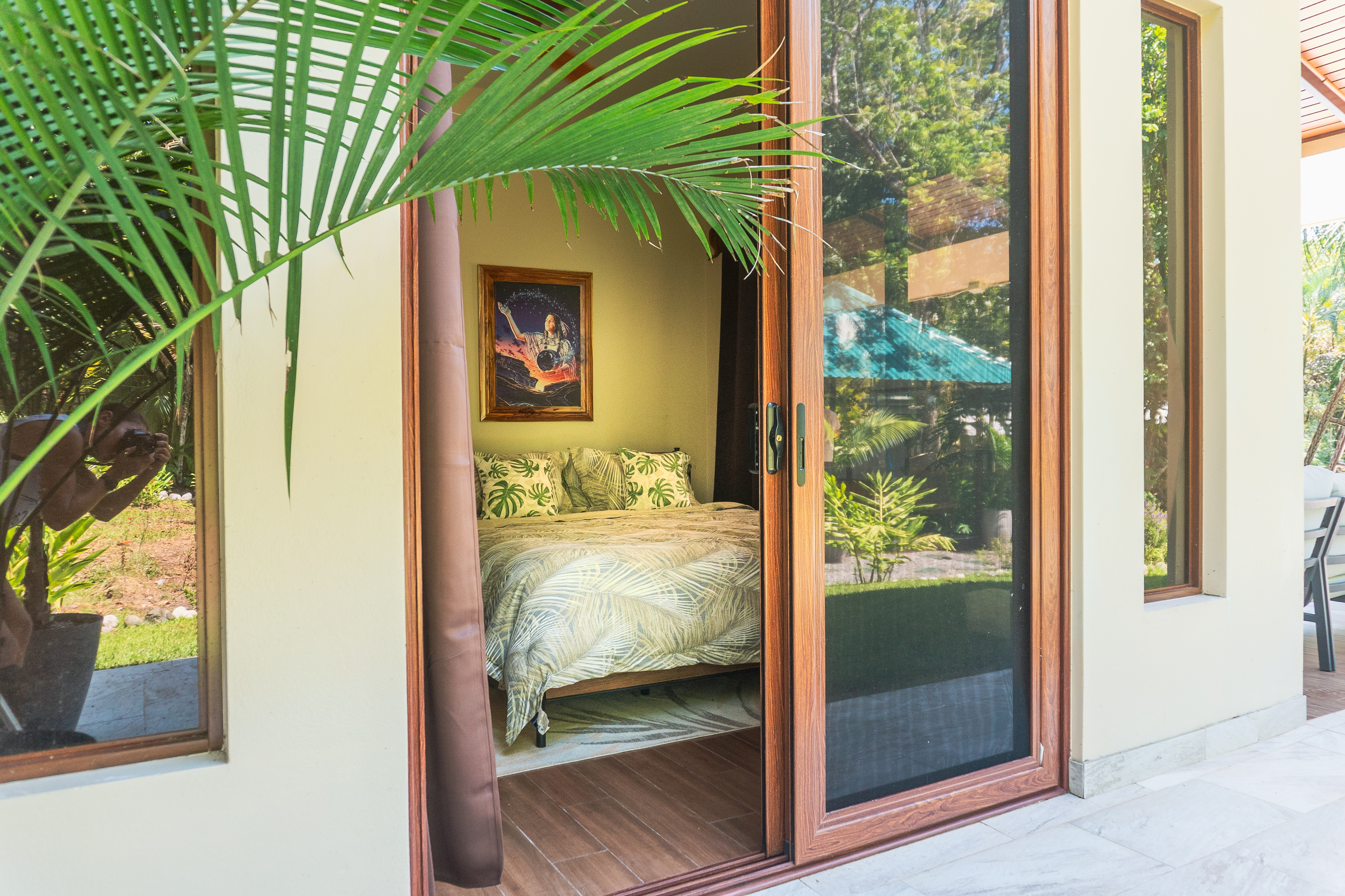 - Villa bedroom seen through an open glass door