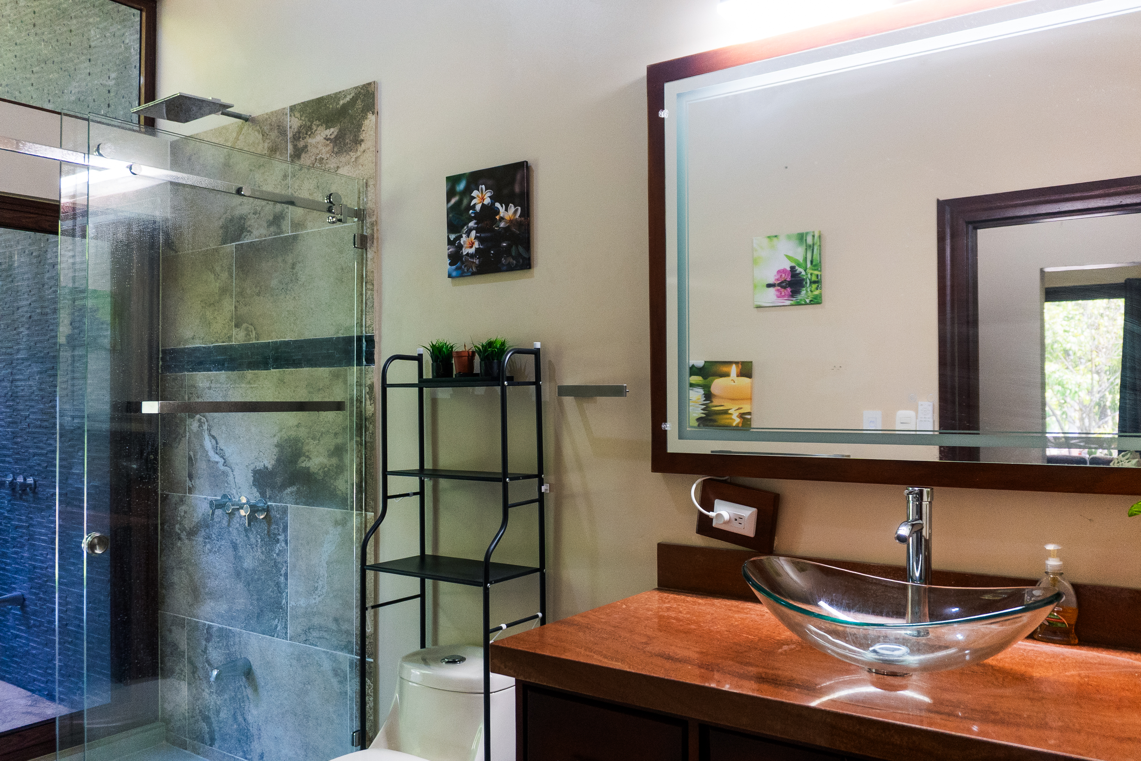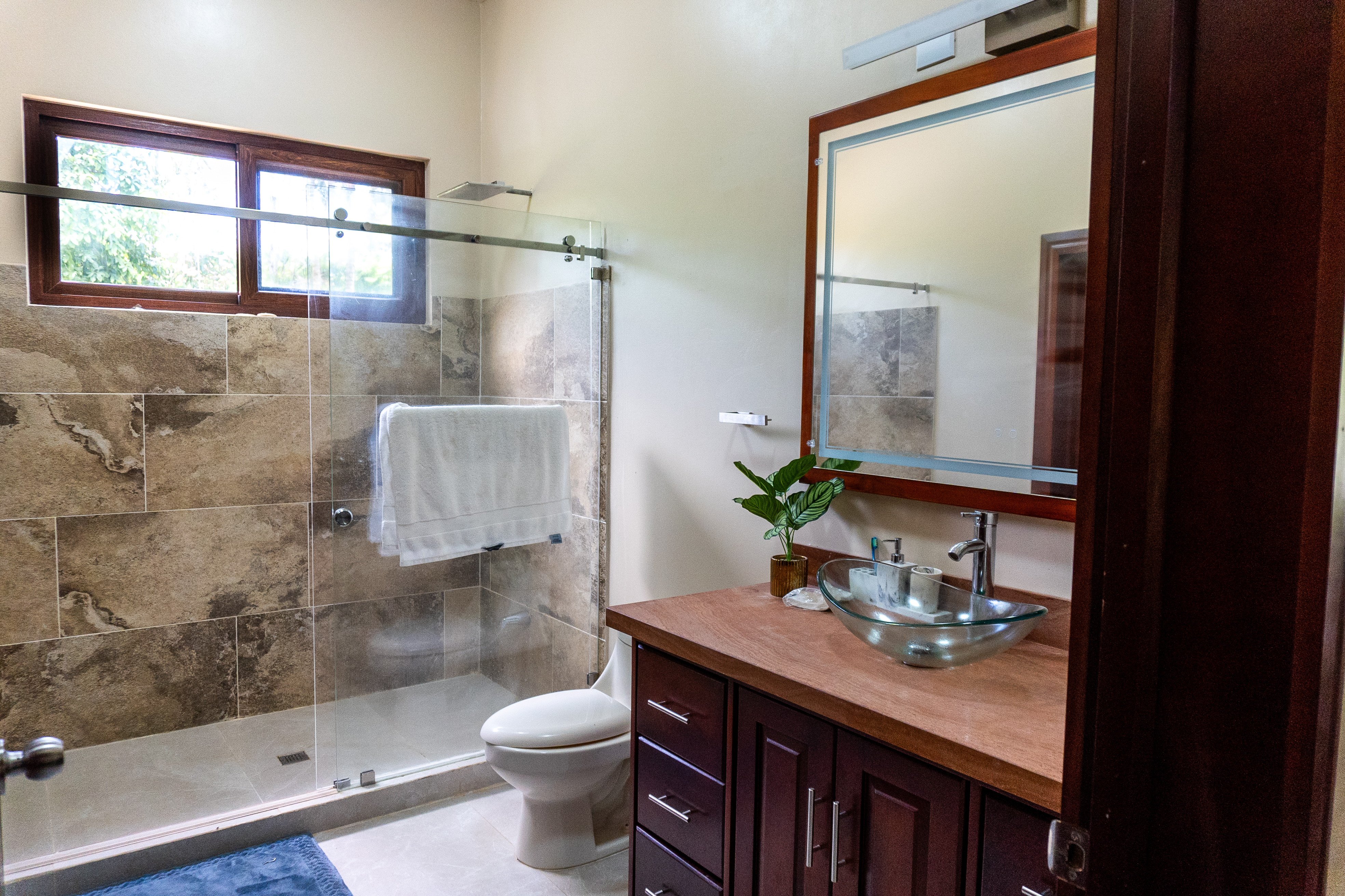 - Villa bathroom with shower, vanity, and mirror