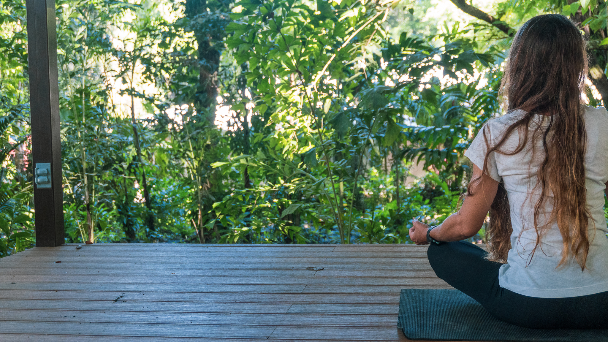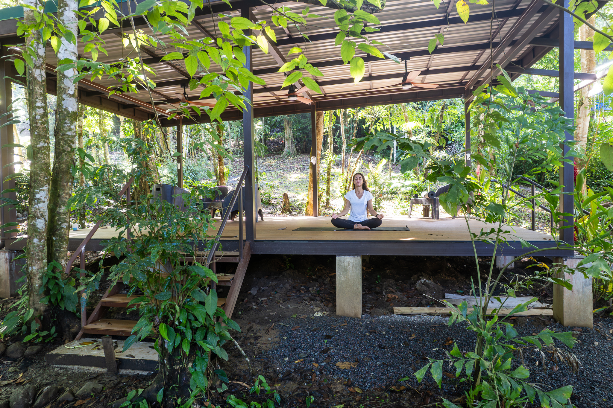 - Woman meditating on a deck at Pavones Resort