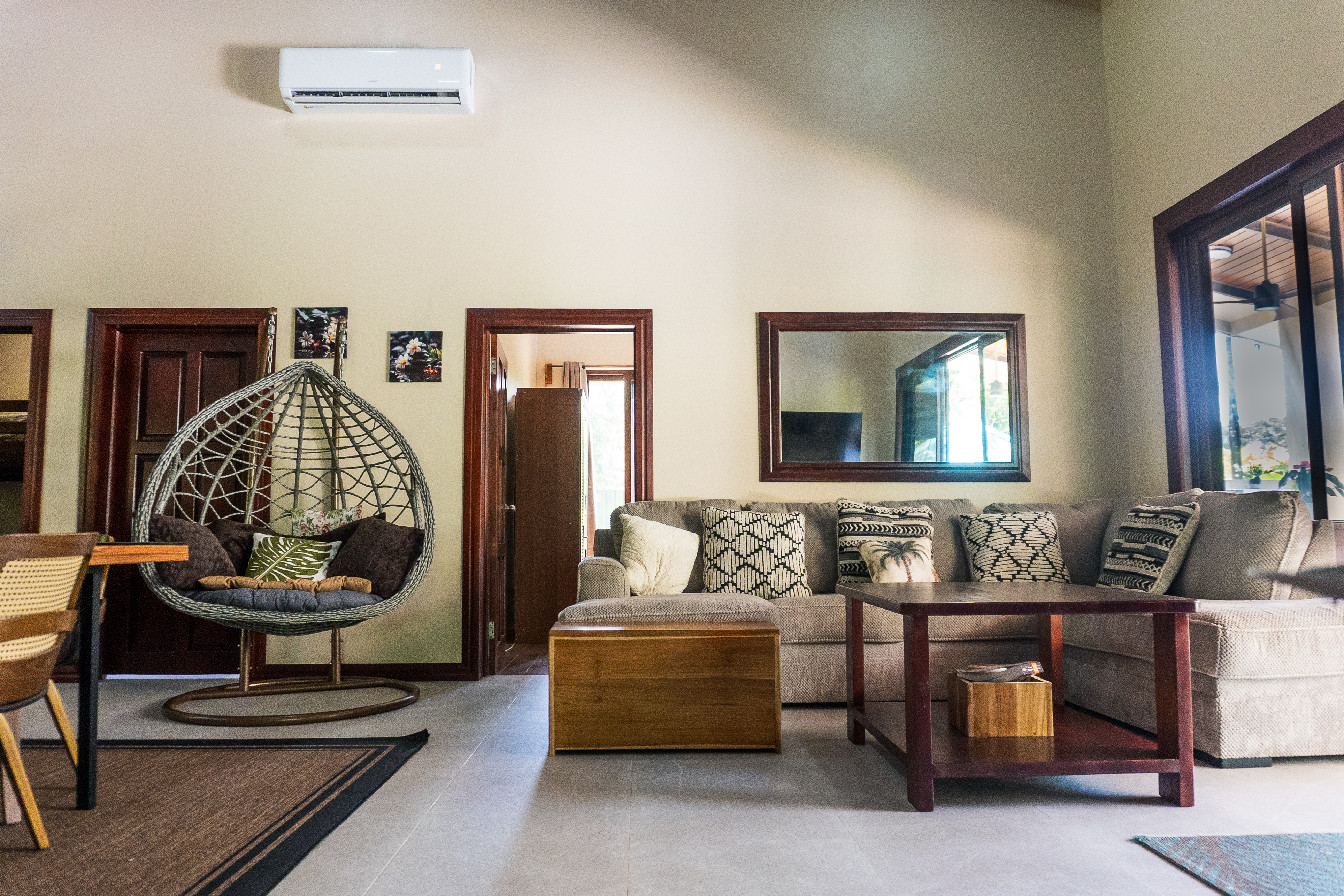 - Pavones Resort Villa living room with sofa and hanging chair