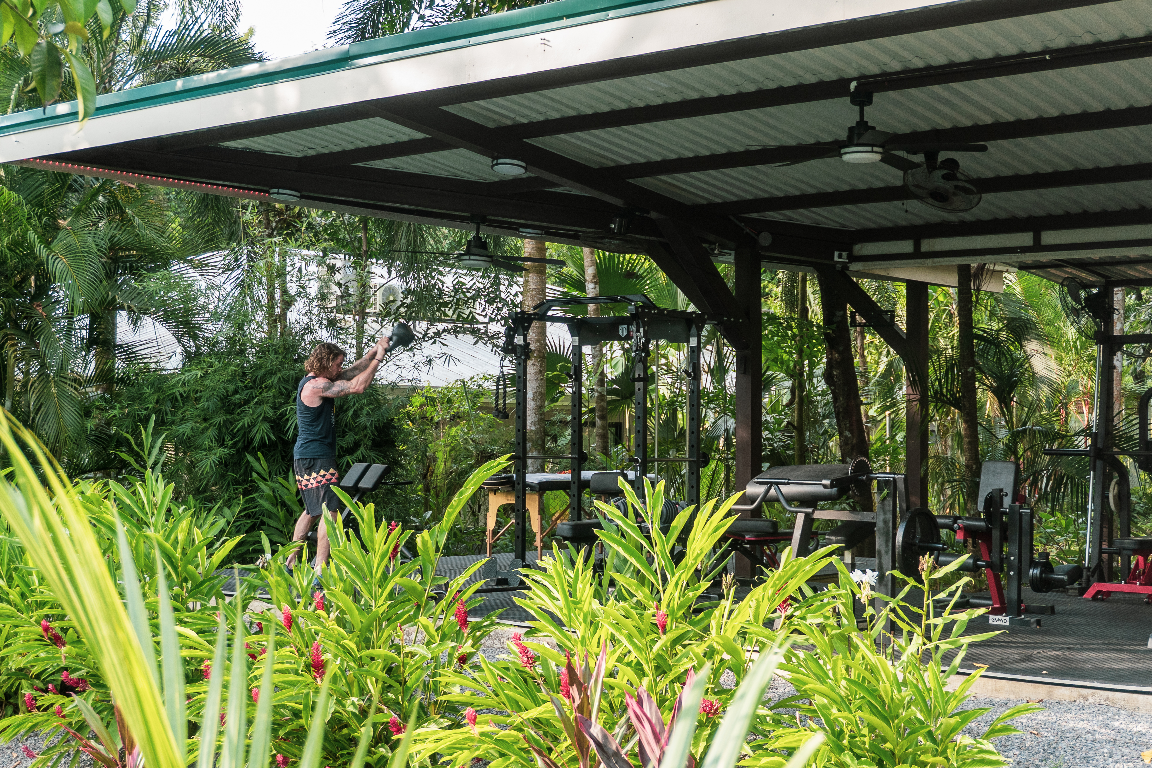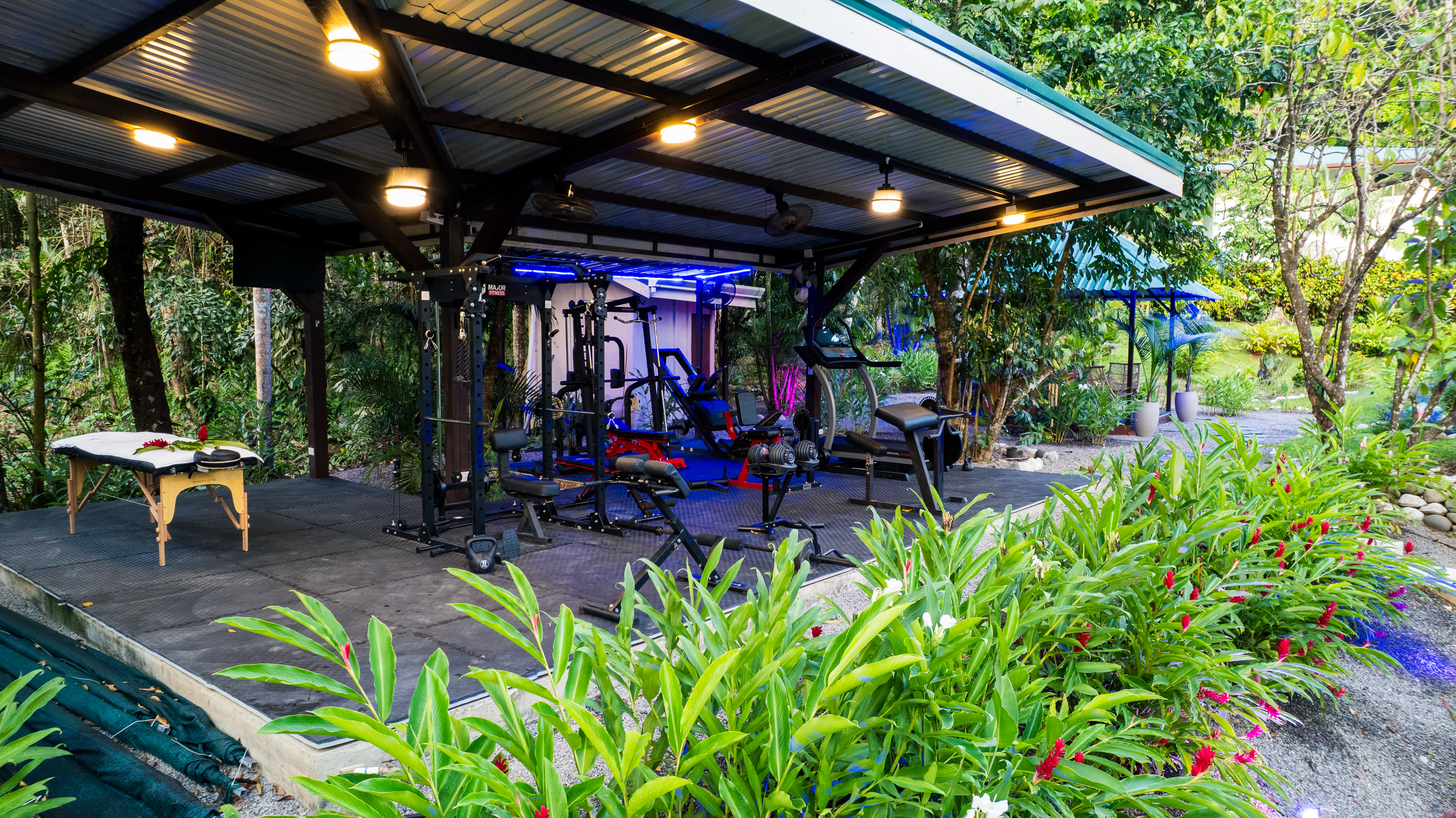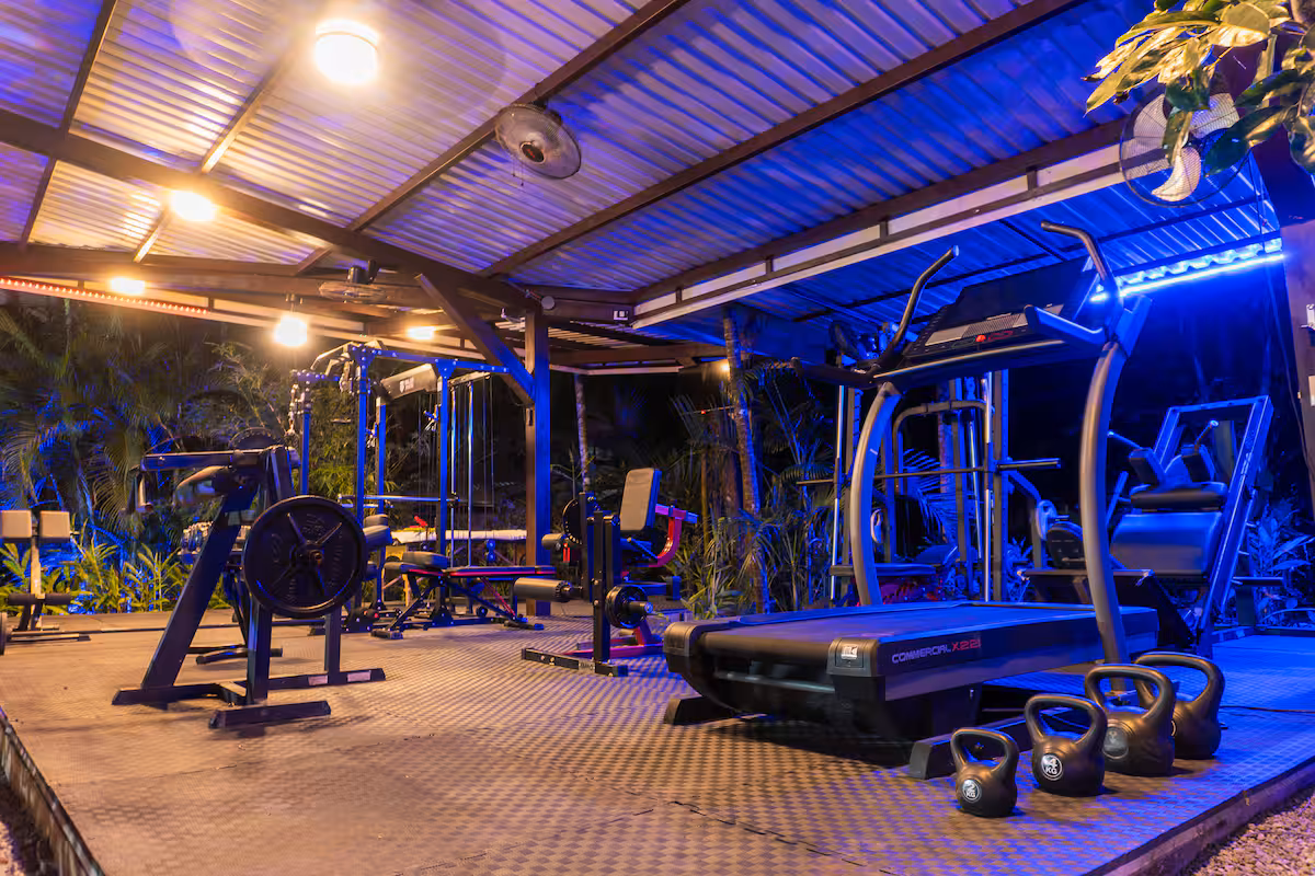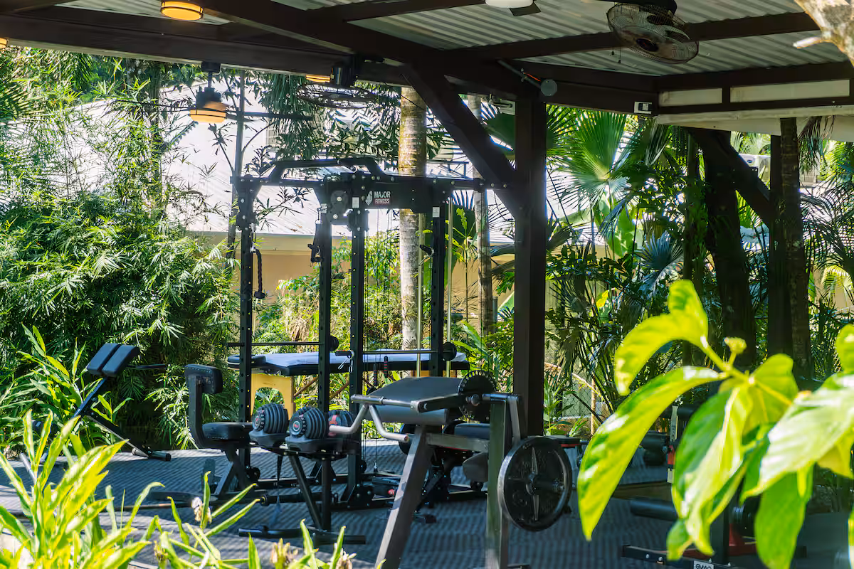 - Open-air gym at Pavones Resort with lush plants