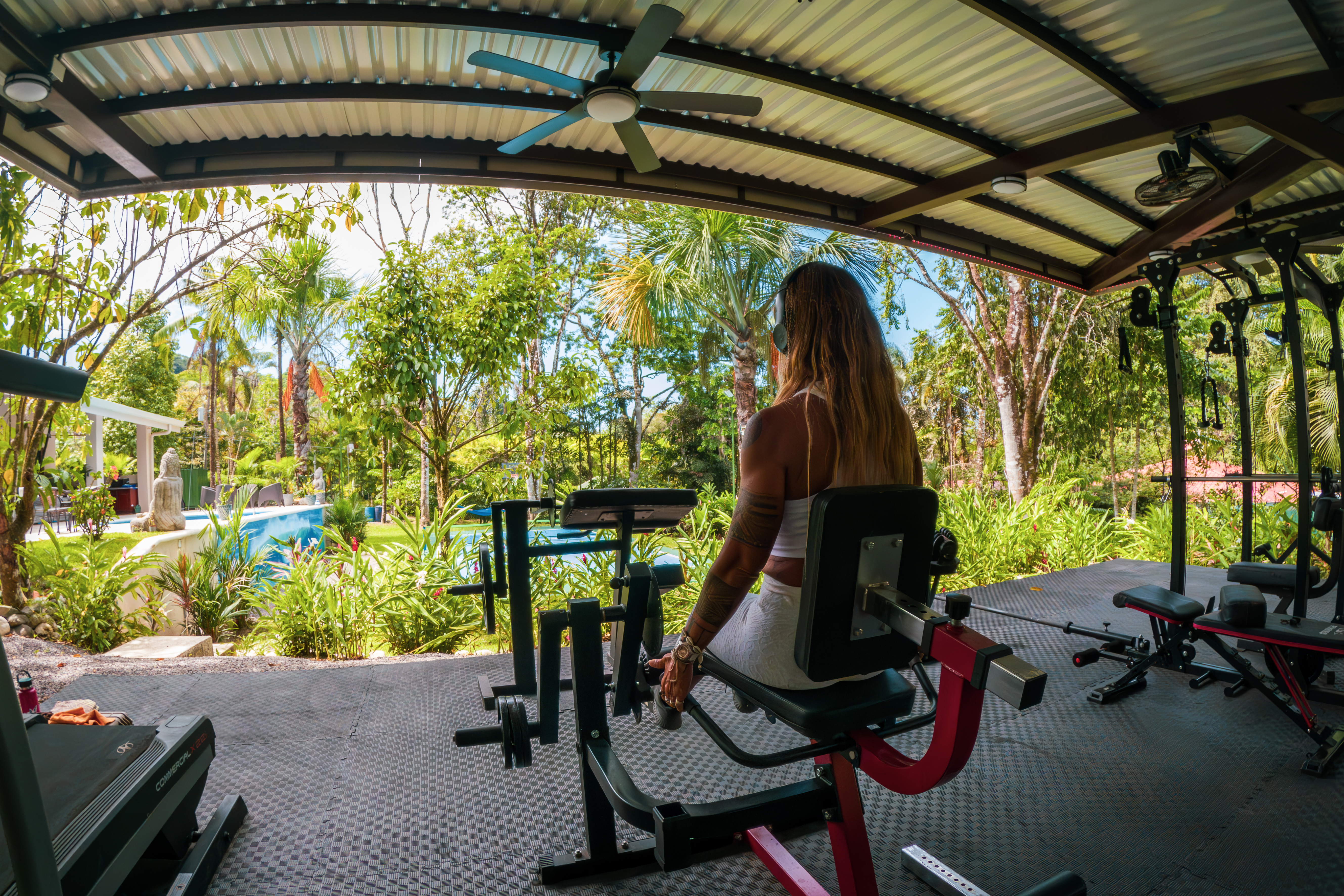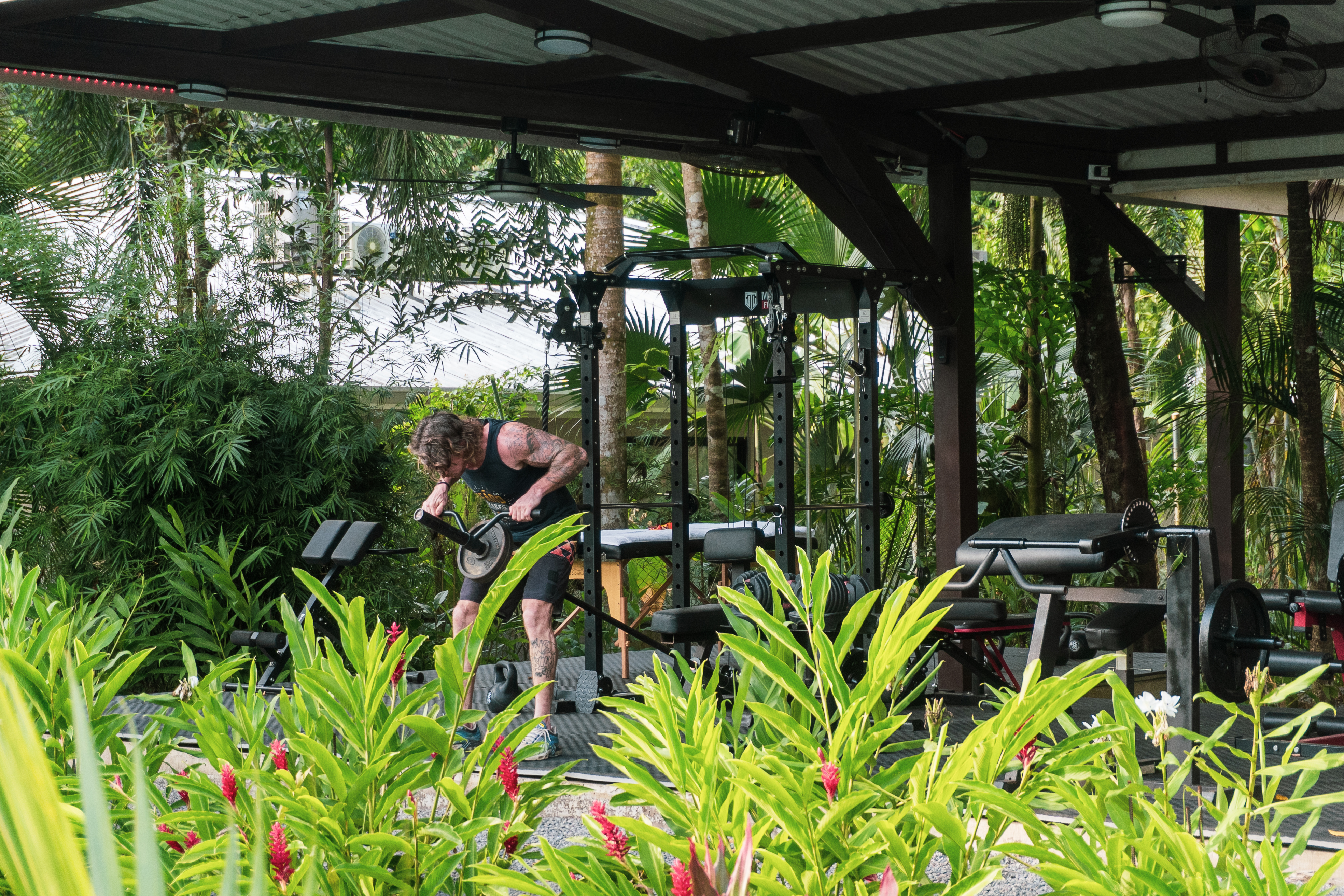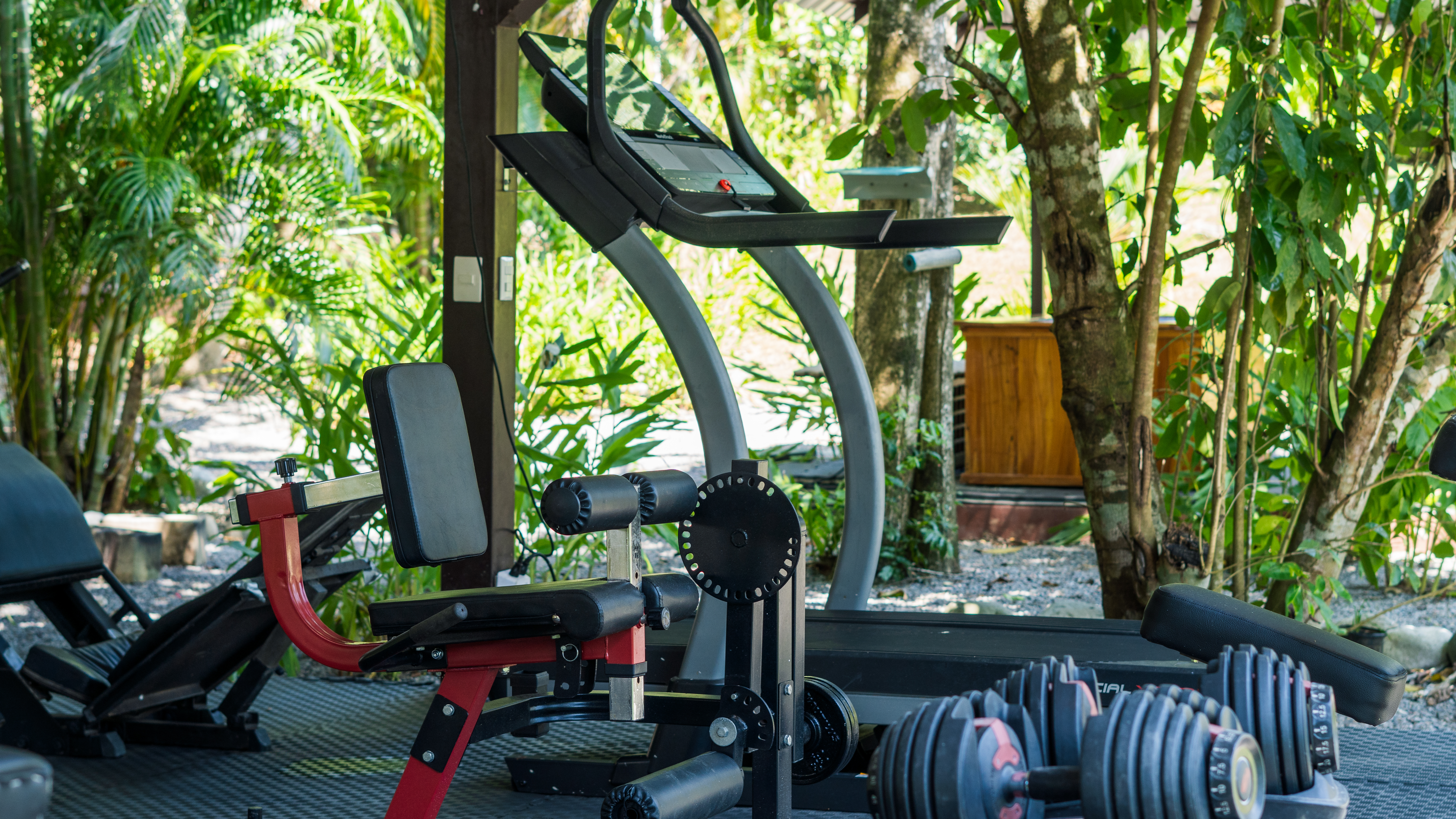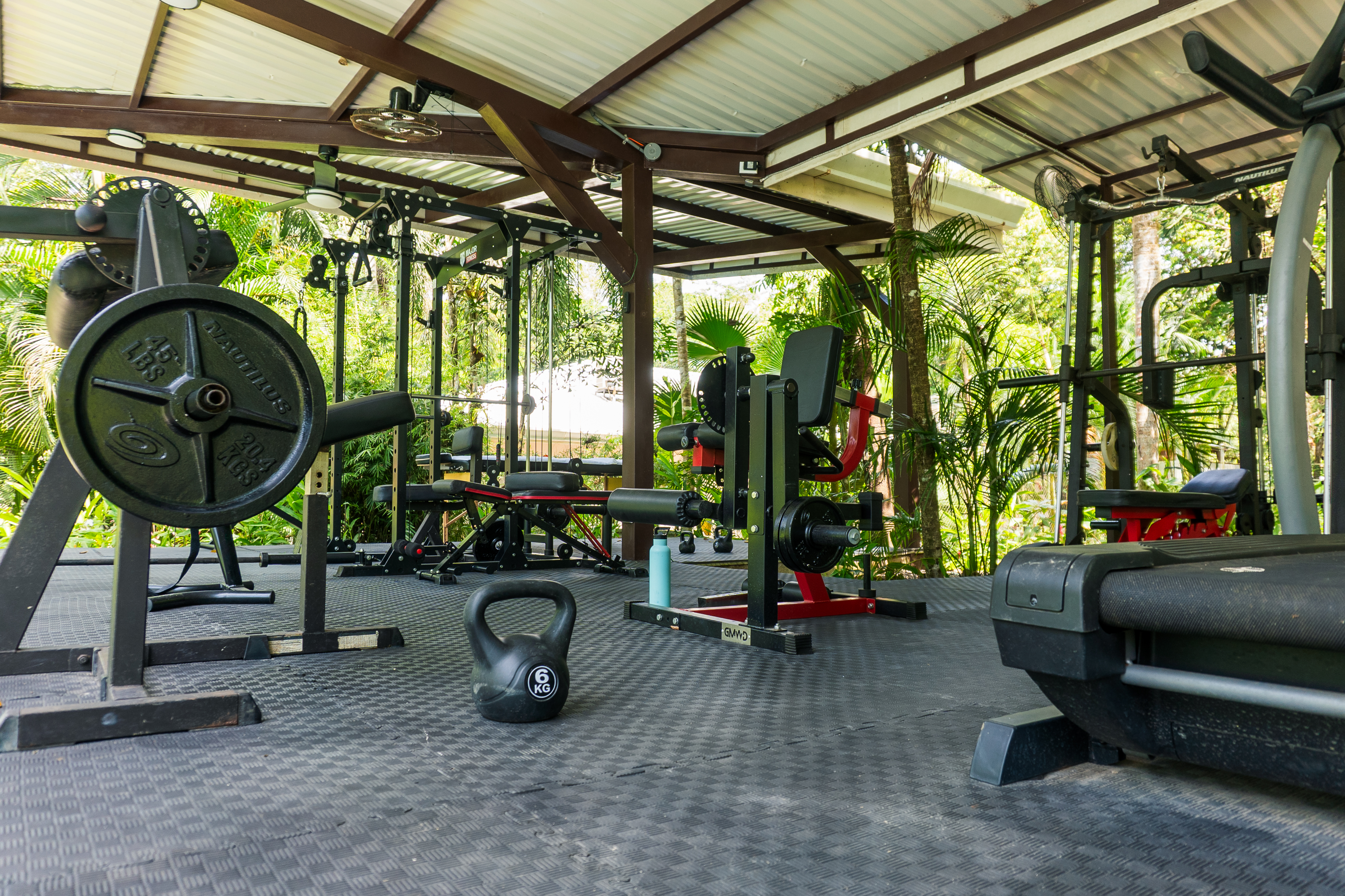- Open-air gym at Pavones Resort with lush plants