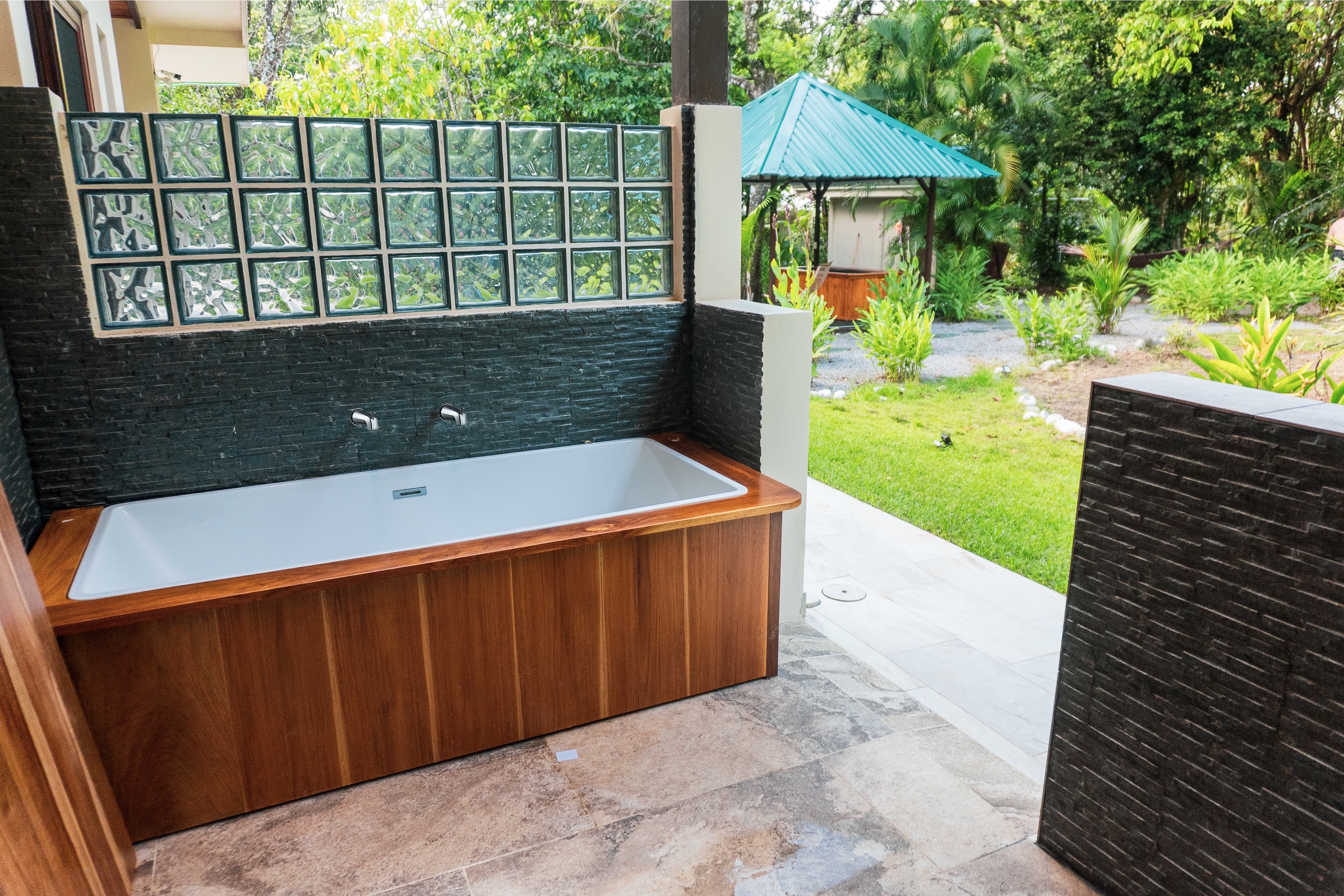 - Outdoor bathtub with glass blocks at Pavones Resort