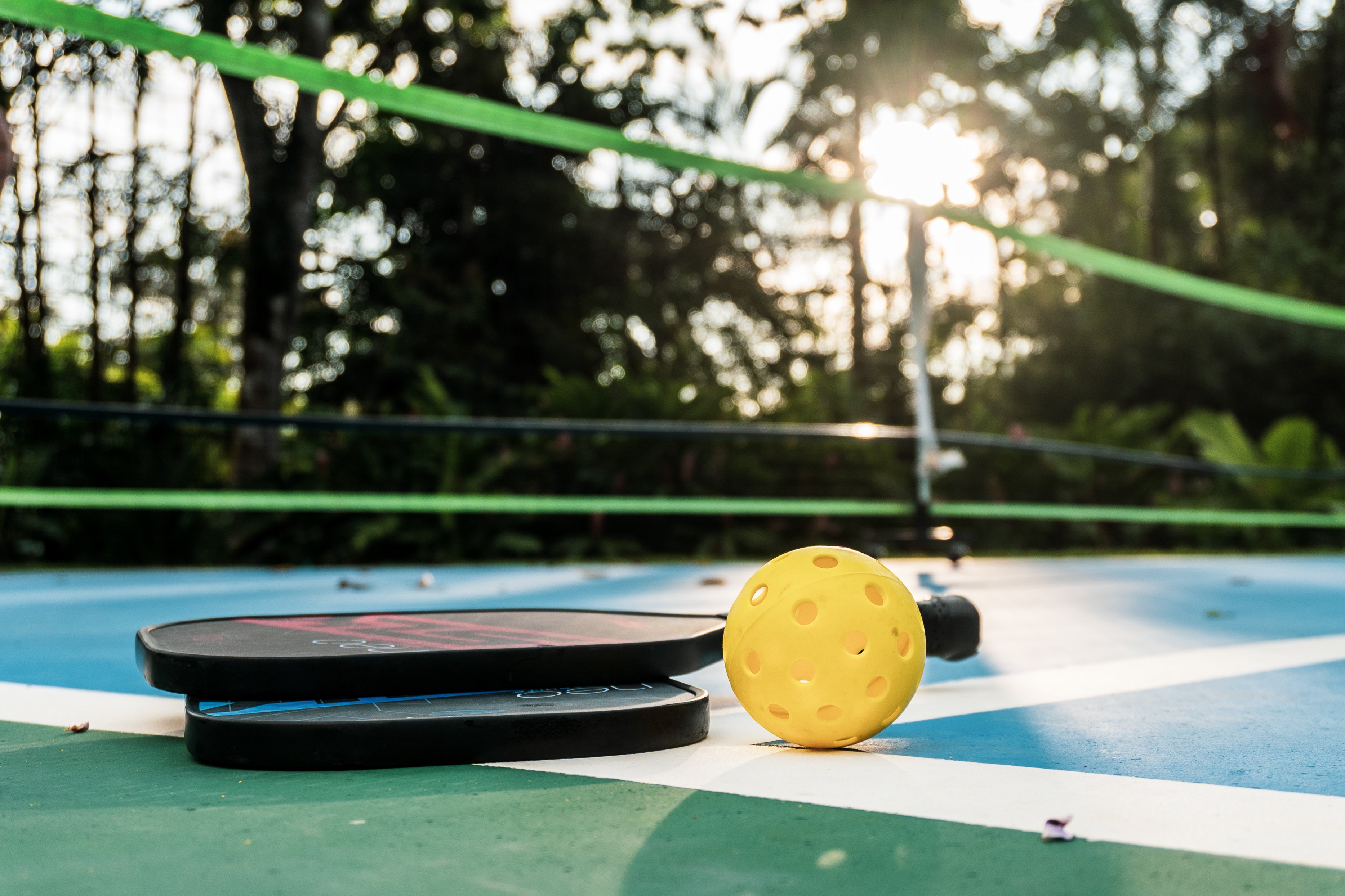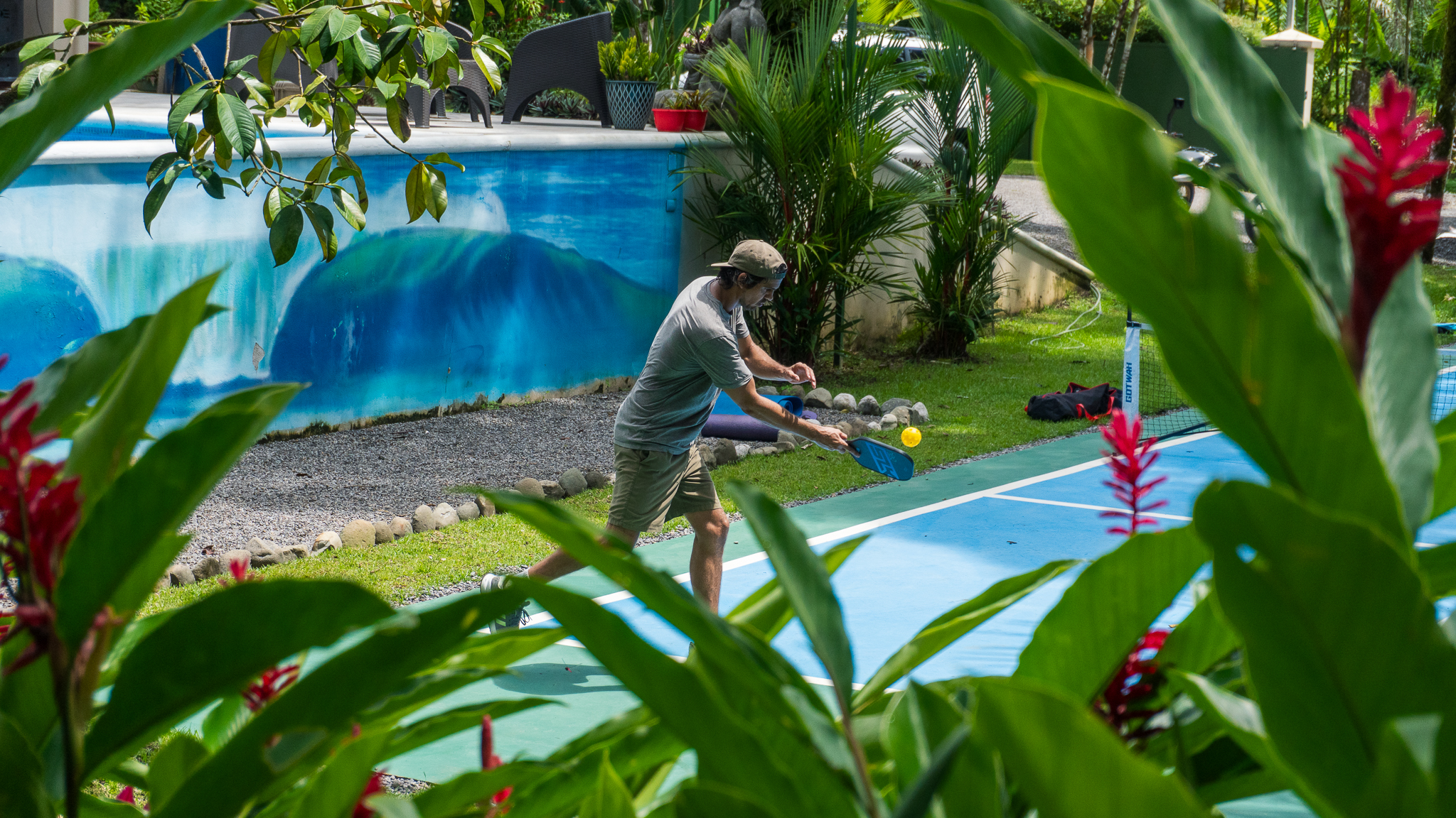 - Pickleball court at Pavones Resort with ball and paddles.