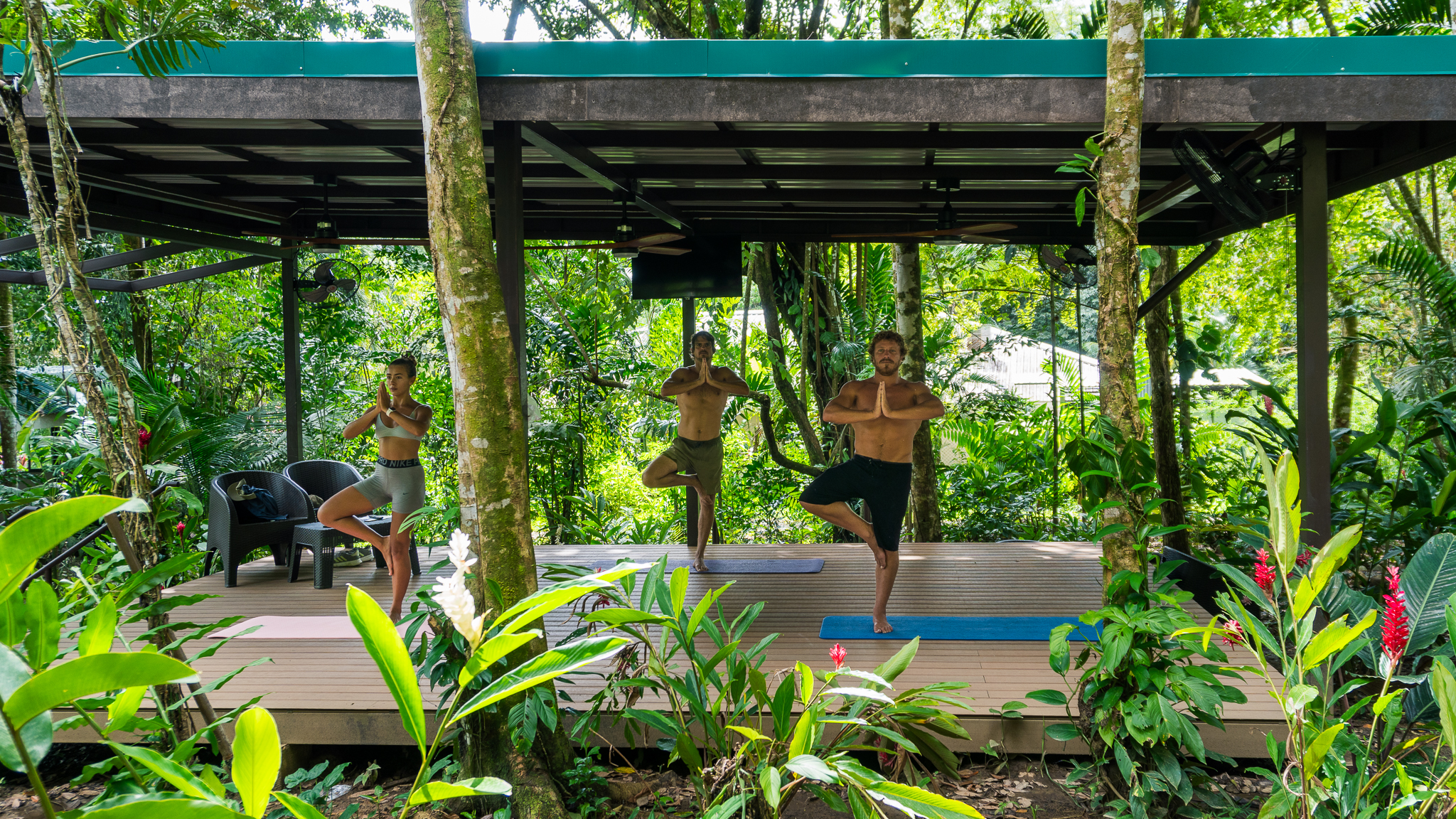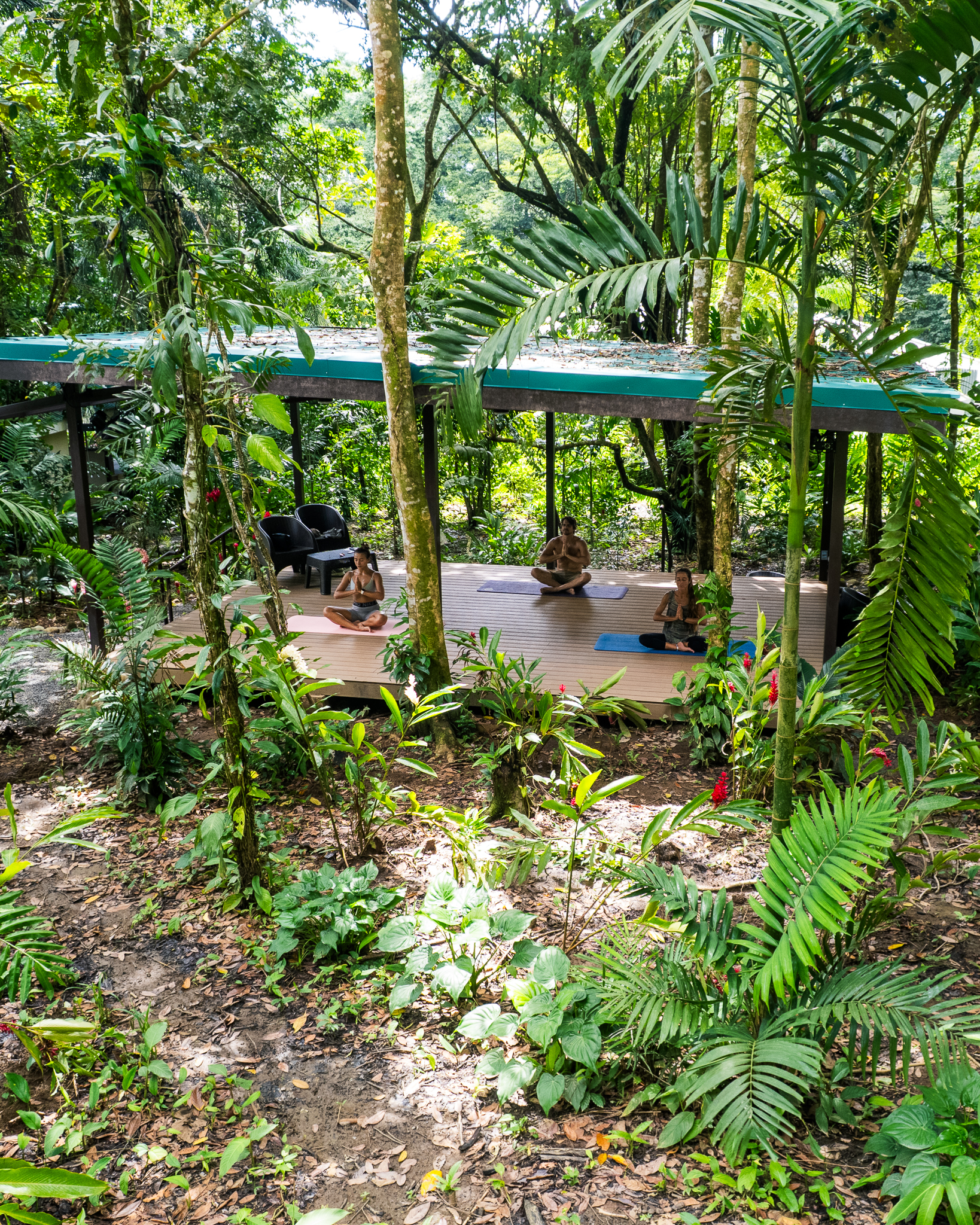 - Jungle yoga deck with people at Pavones Resort