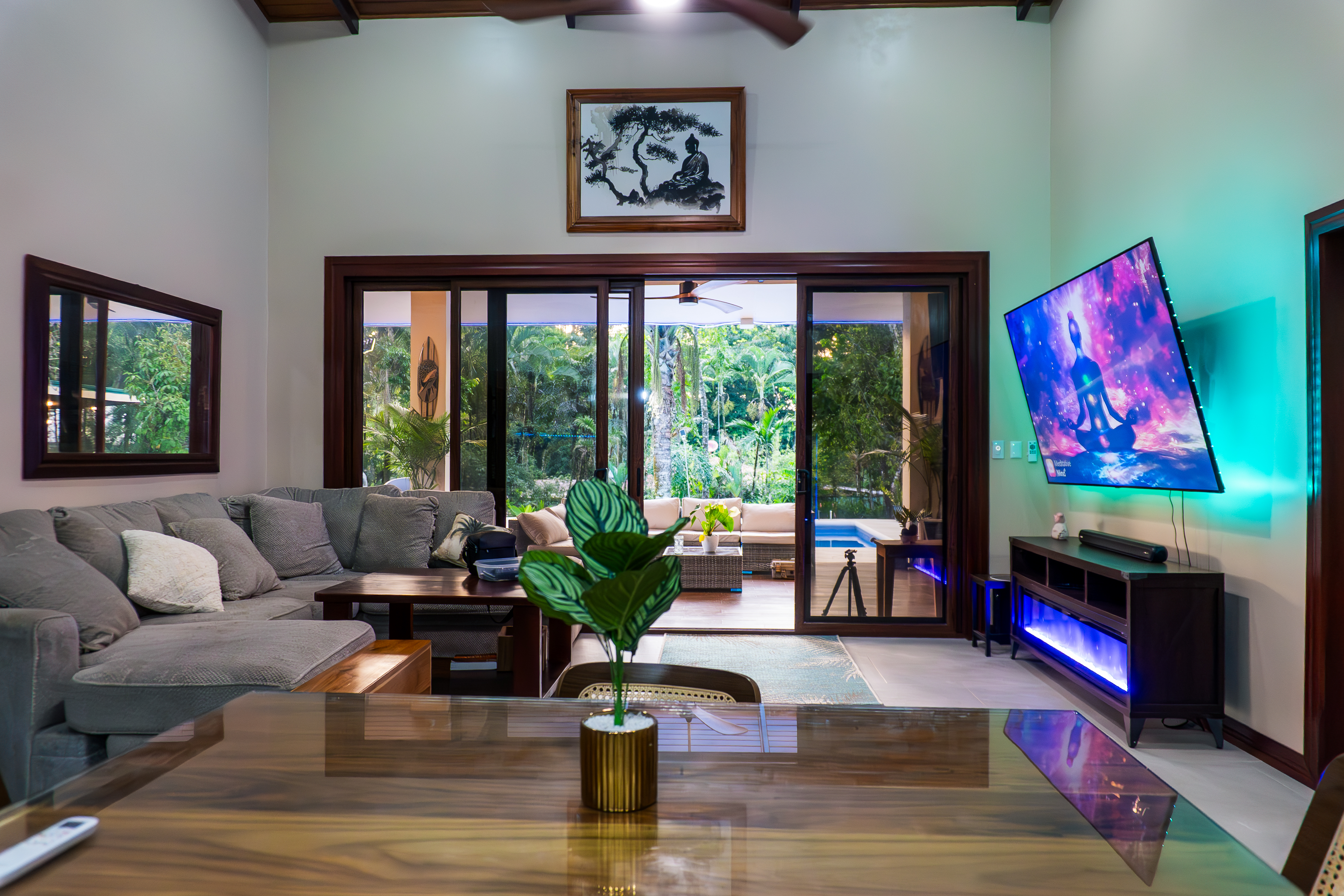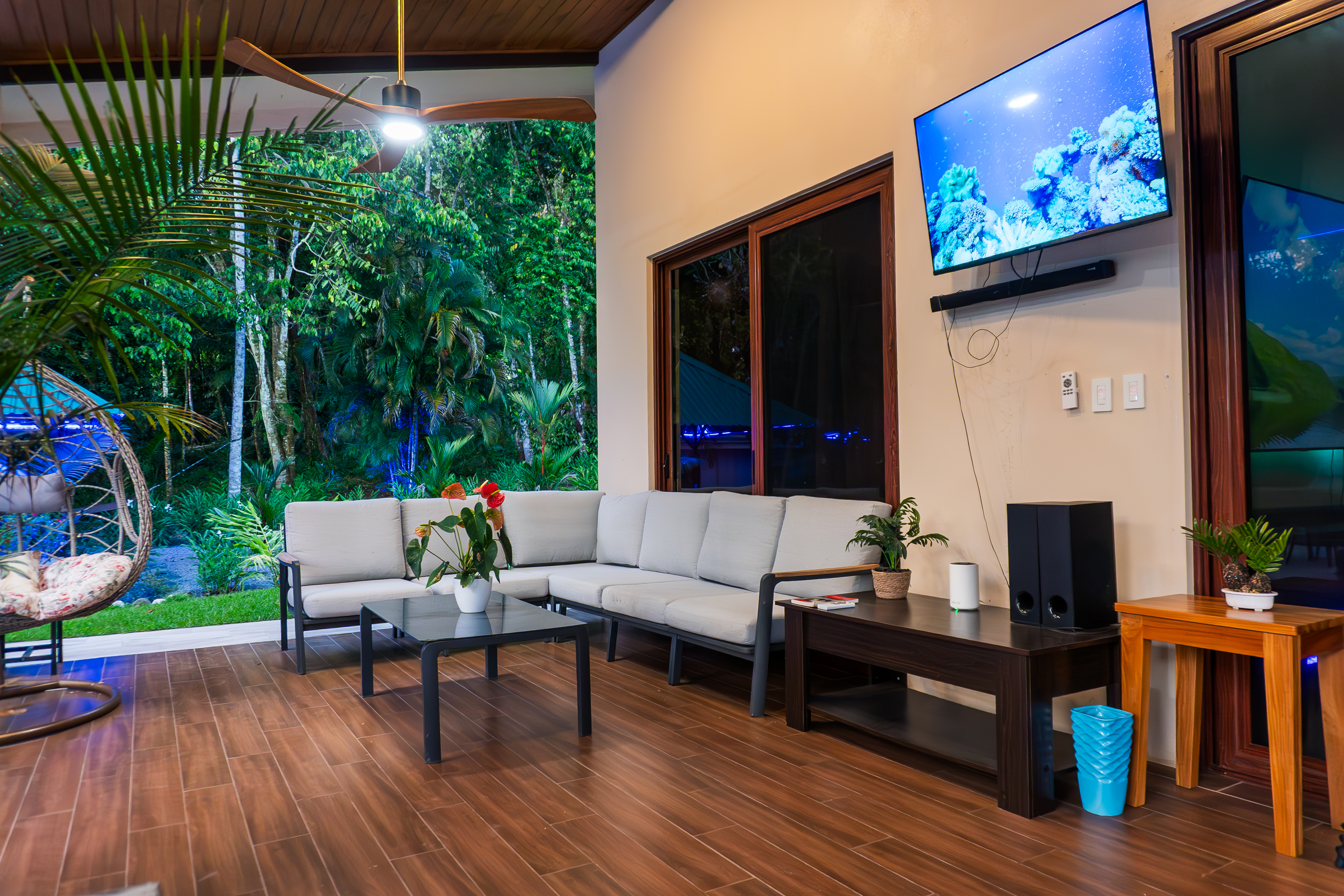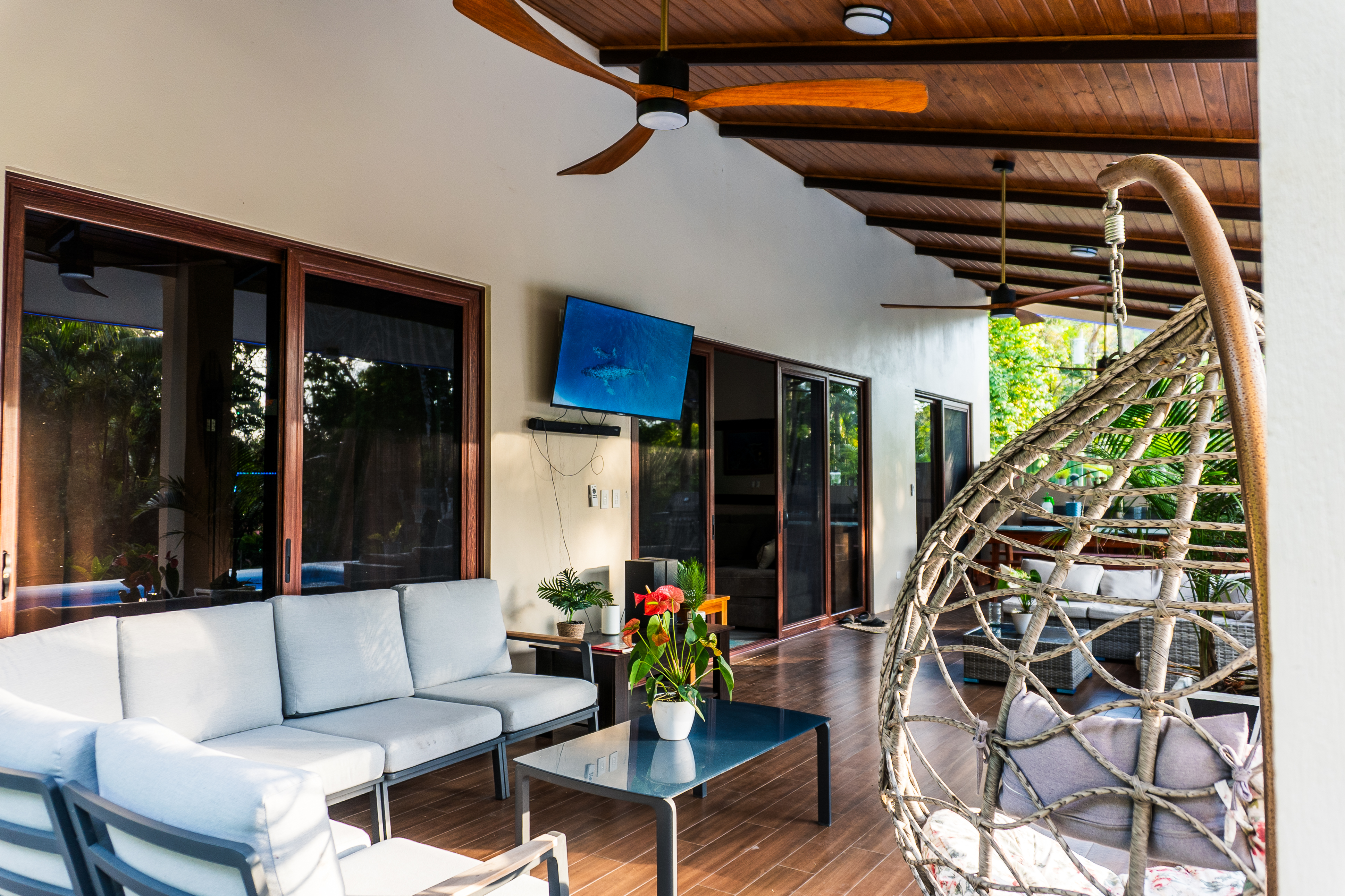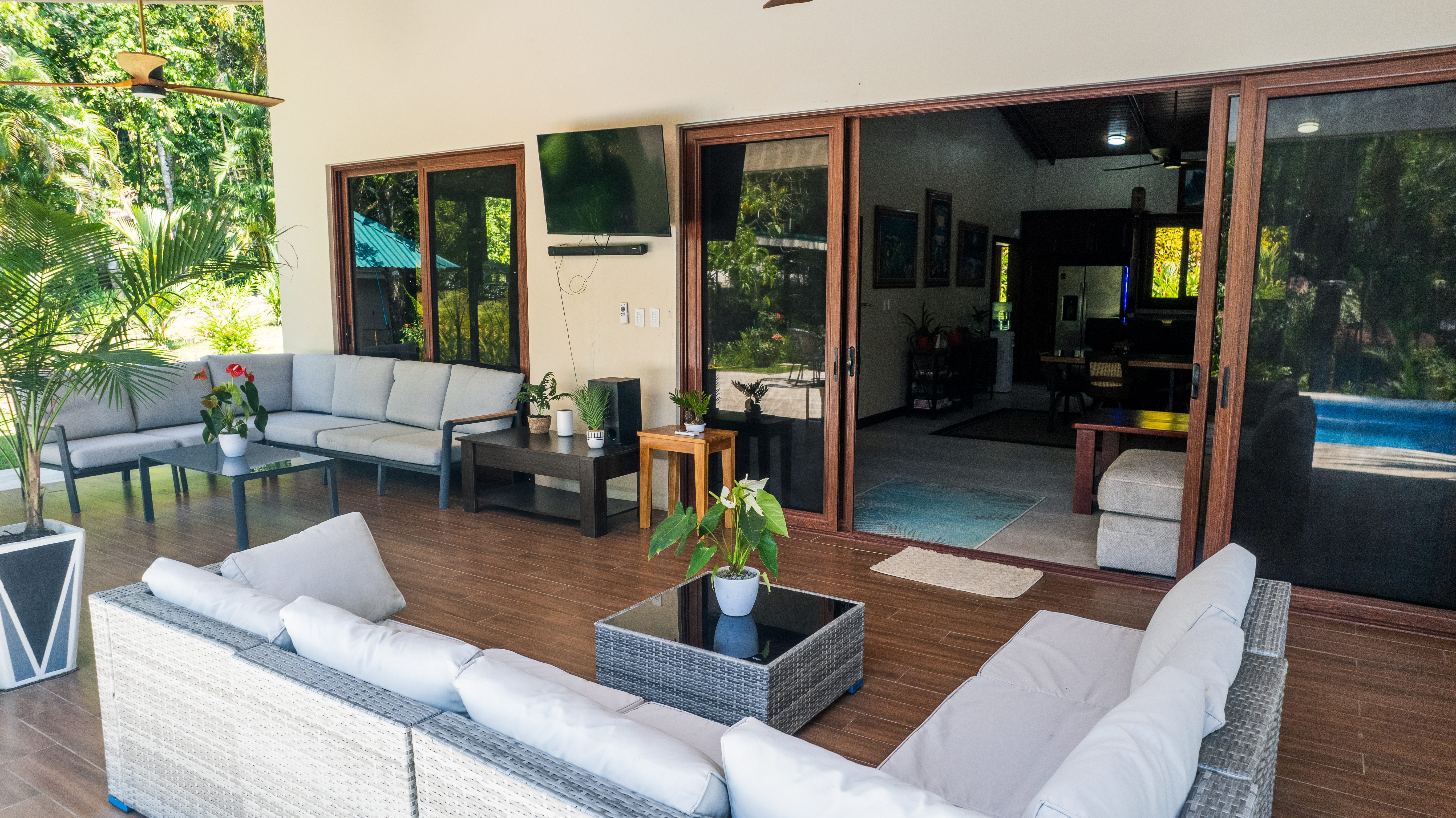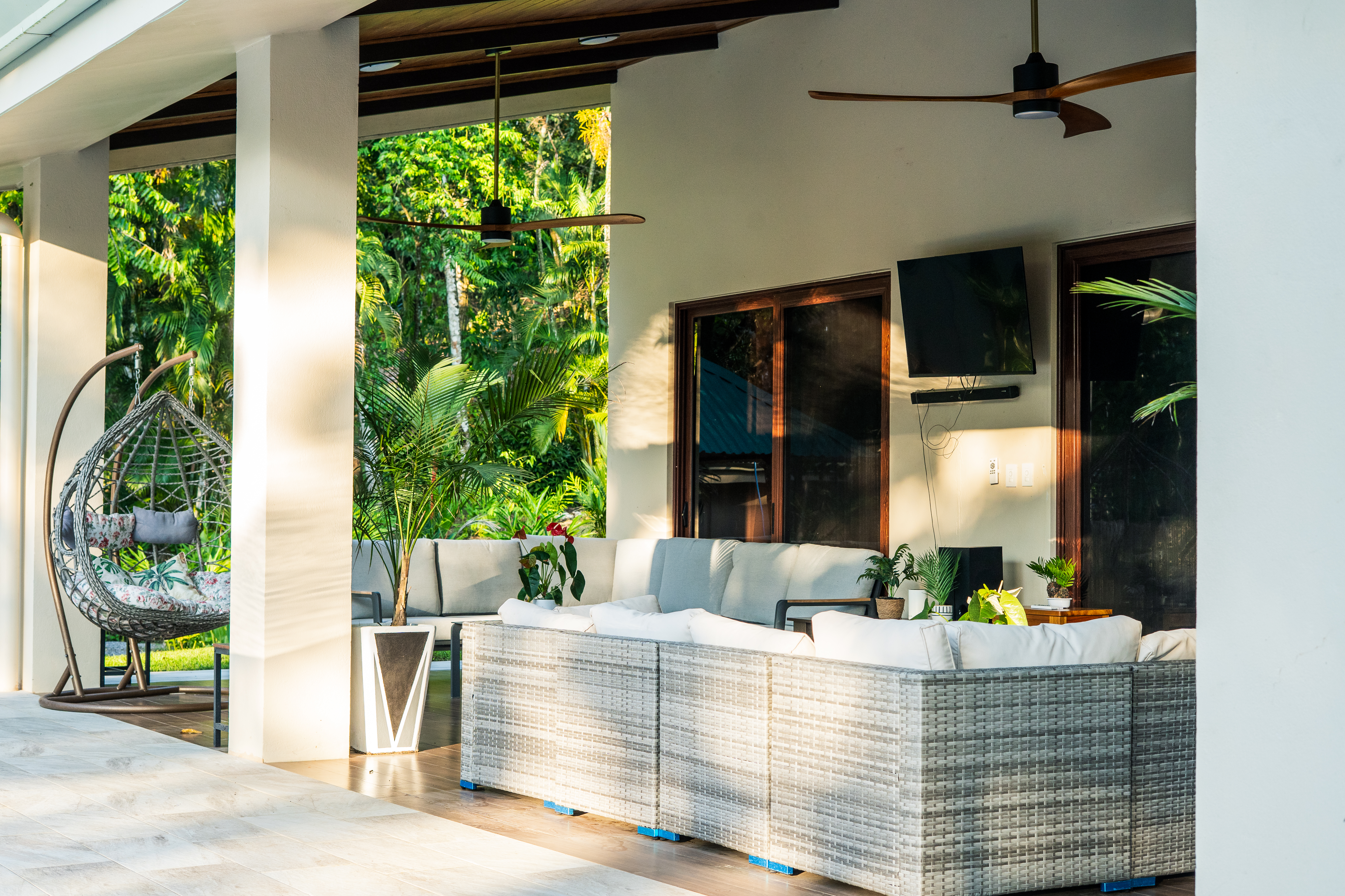 - Outdoor villa patio with sofas, TV, and fans, Pavones Resort Gallery