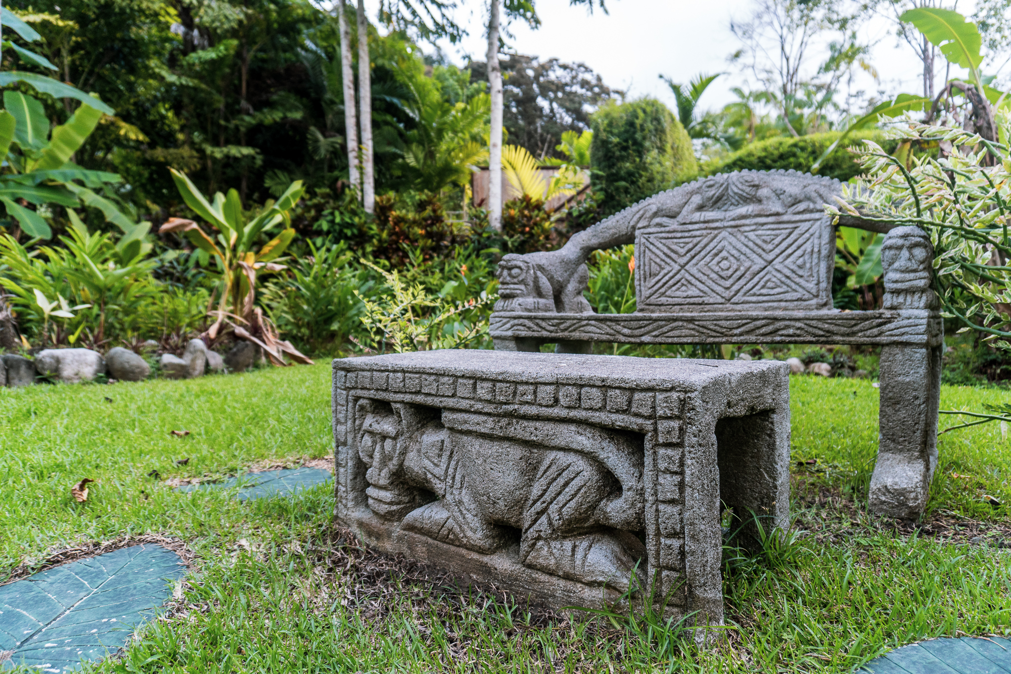 - Carved stone bench and table in Pavones Resort garden