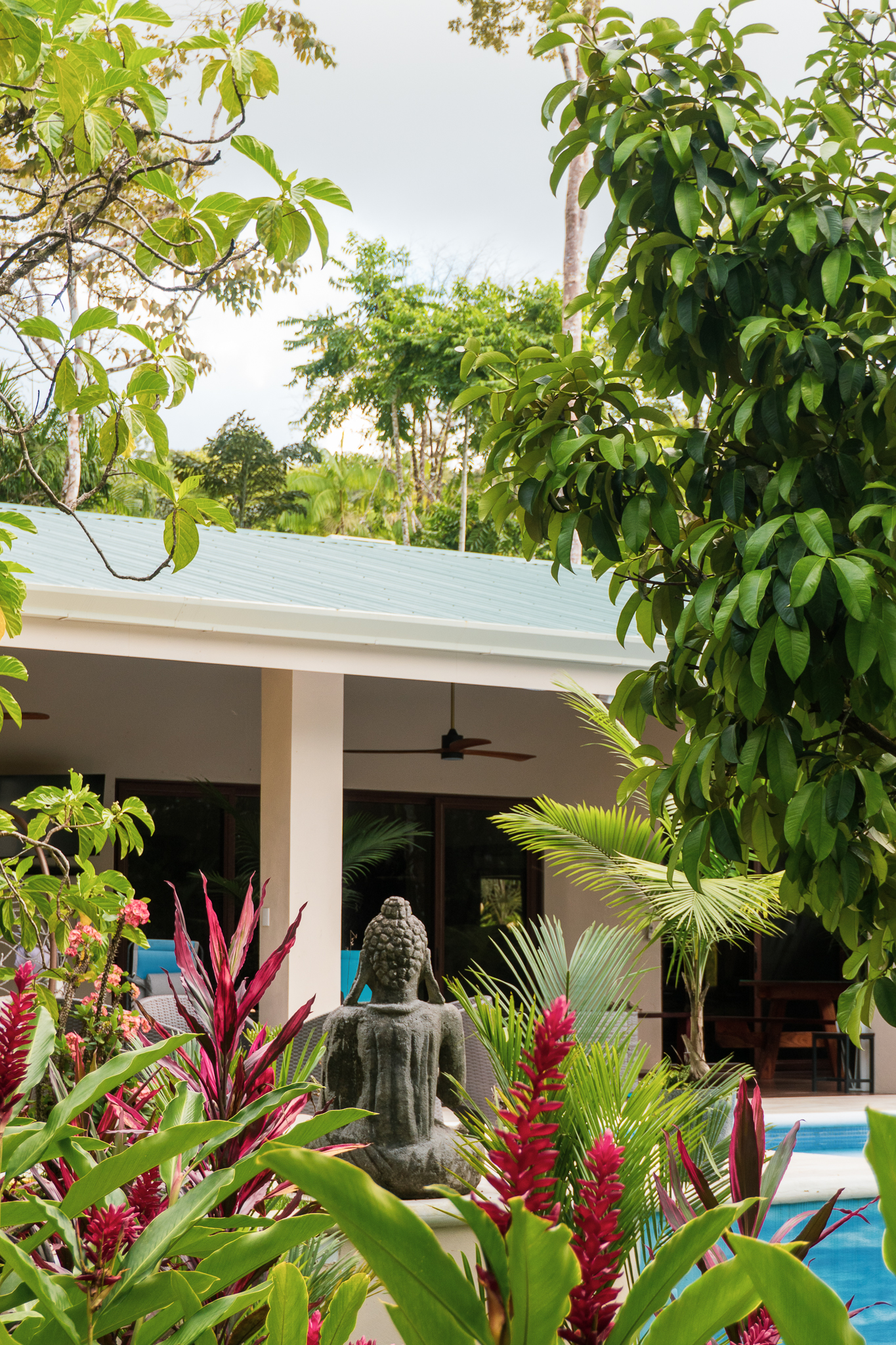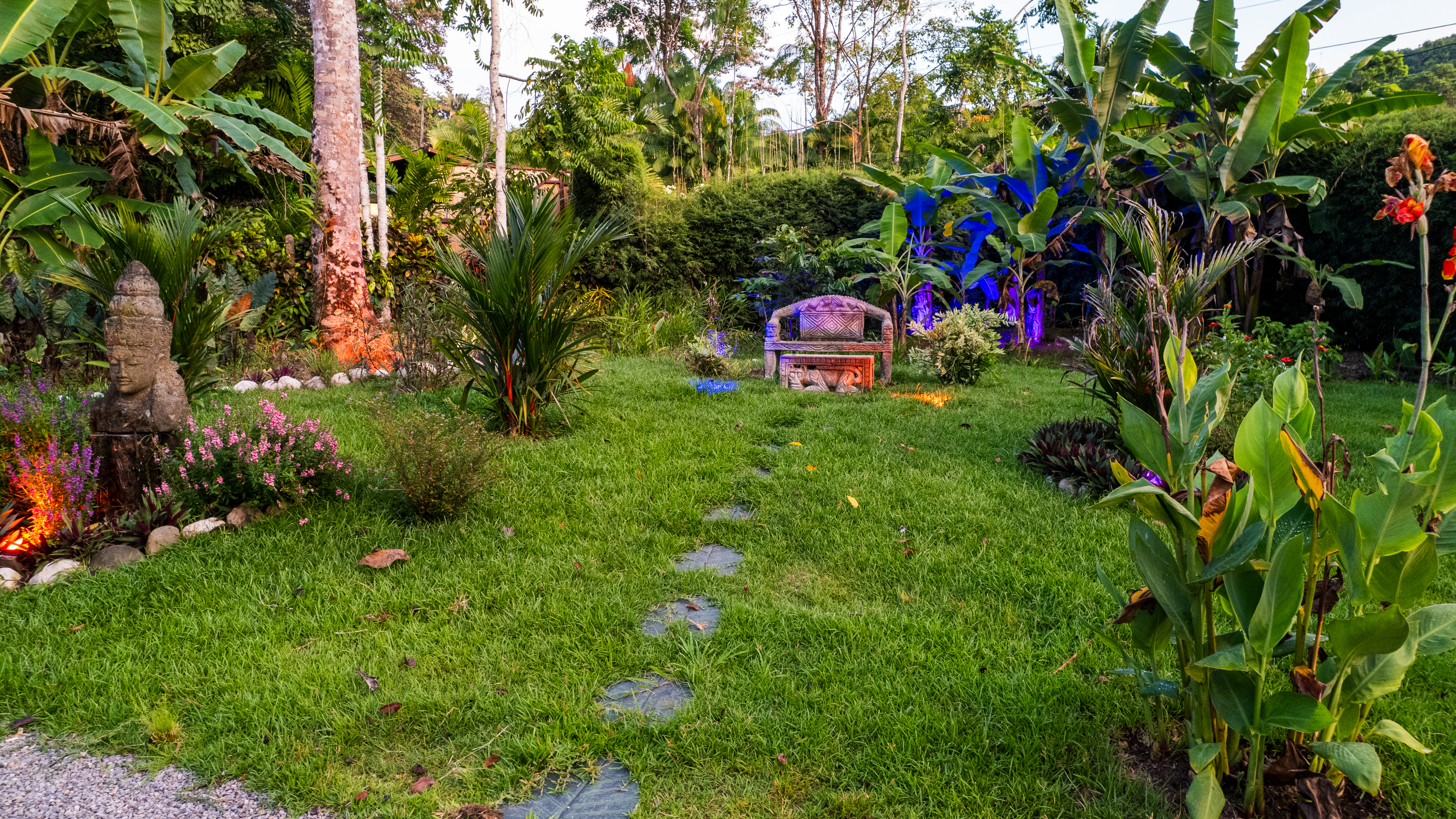 - Tropical garden, Buddha statue, and villa at Pavones Resort.