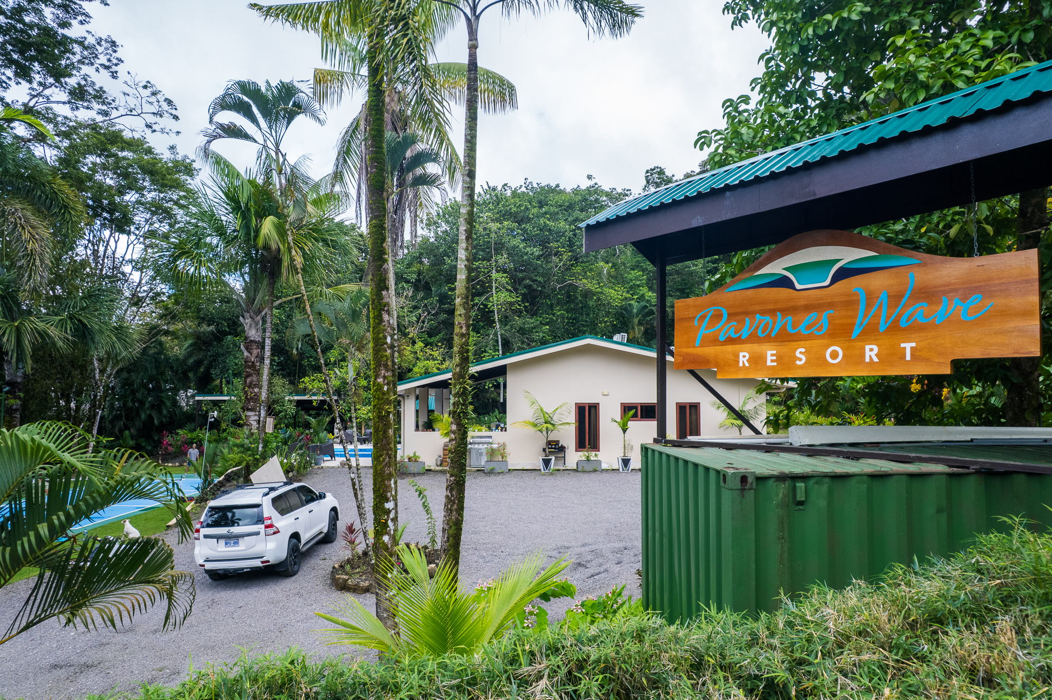 - Pavones Resort entrance sign with tropical foliage
