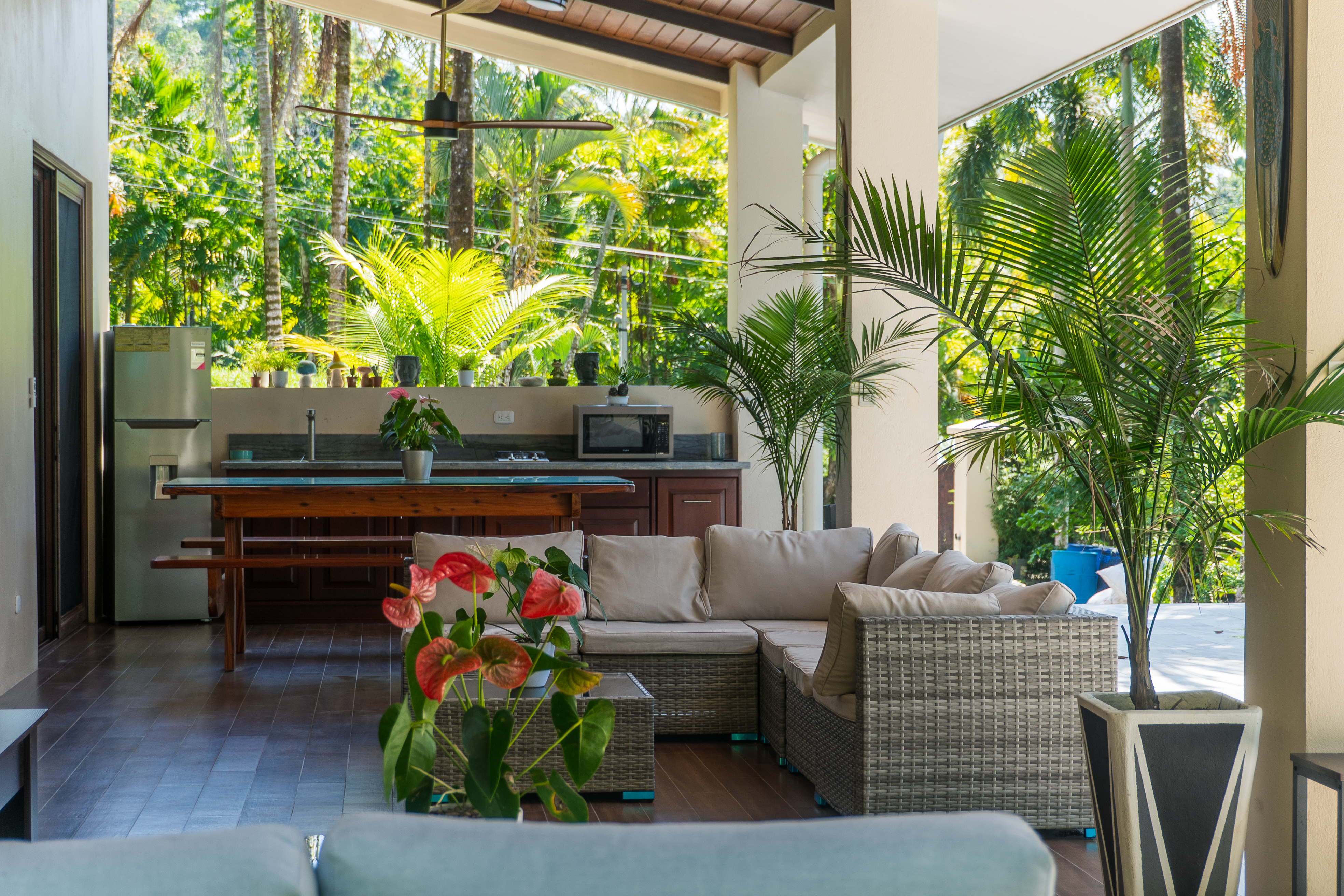 - Outdoor patio with sectional sofa and tropical garden at Pavones Resort