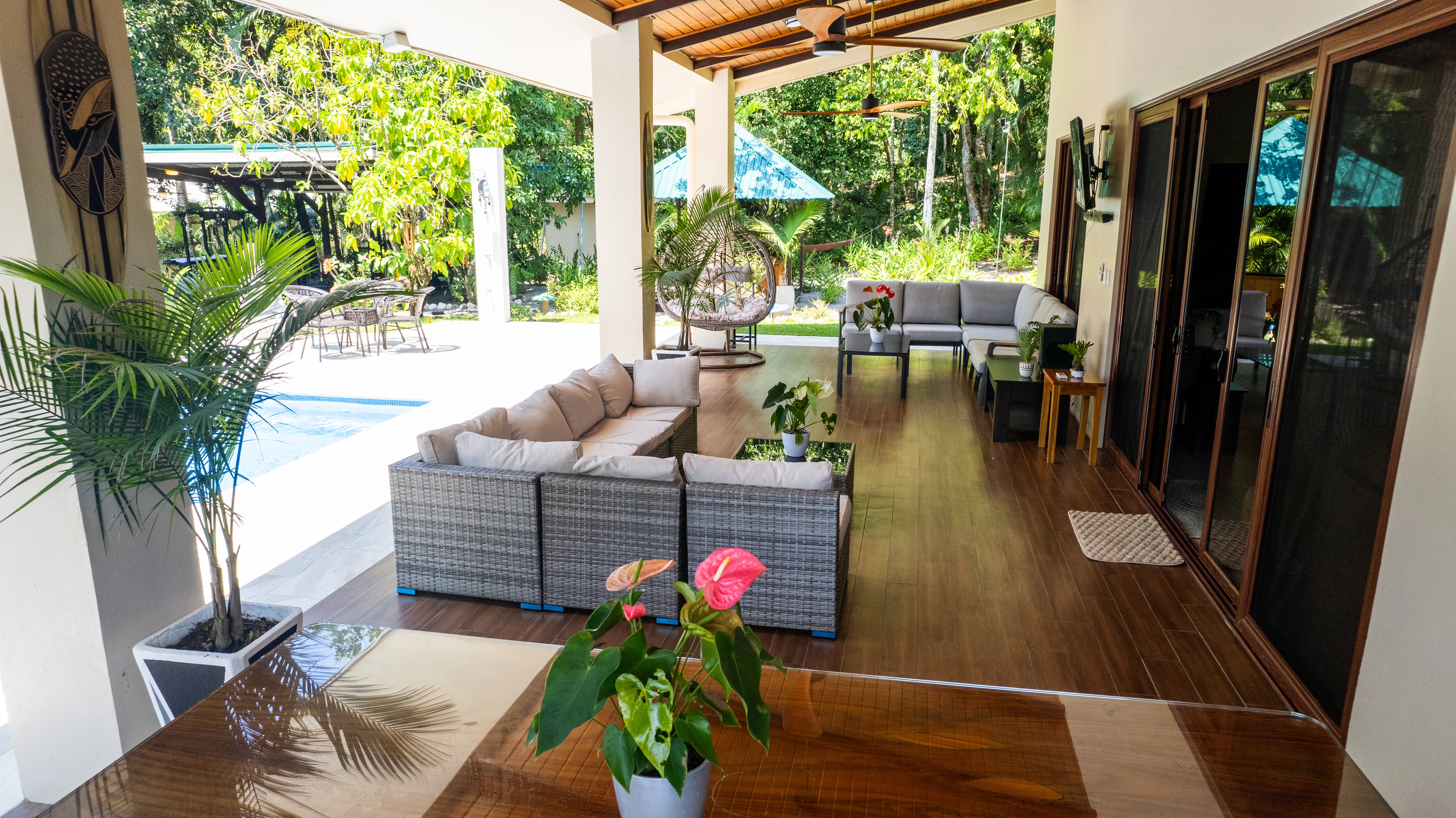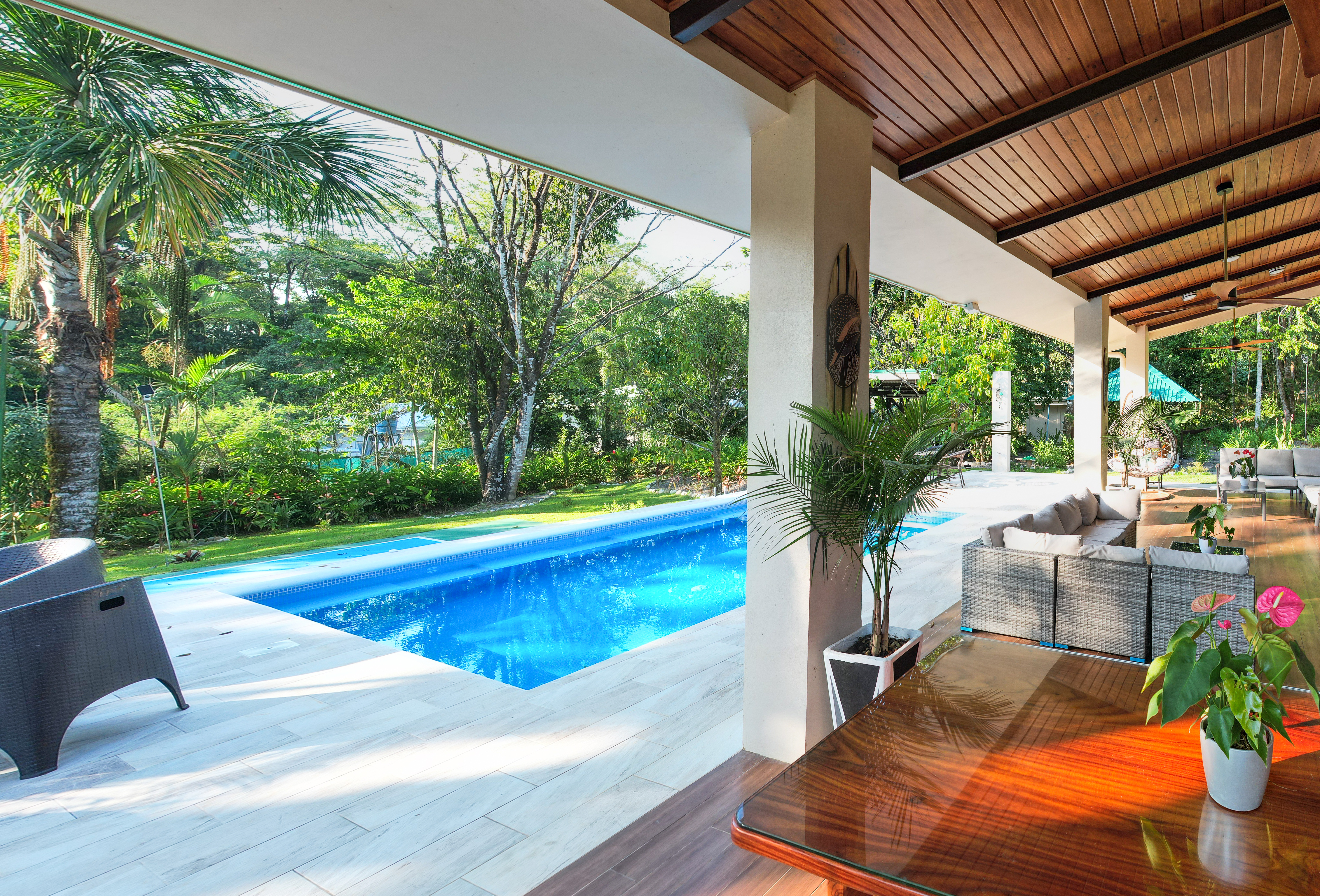 - Pavones Resort Villa patio with pool and tropical garden