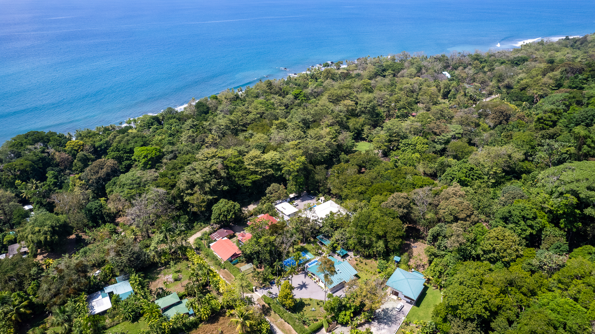 - Aerial view of Pavones Resort nestled in jungle by ocean
