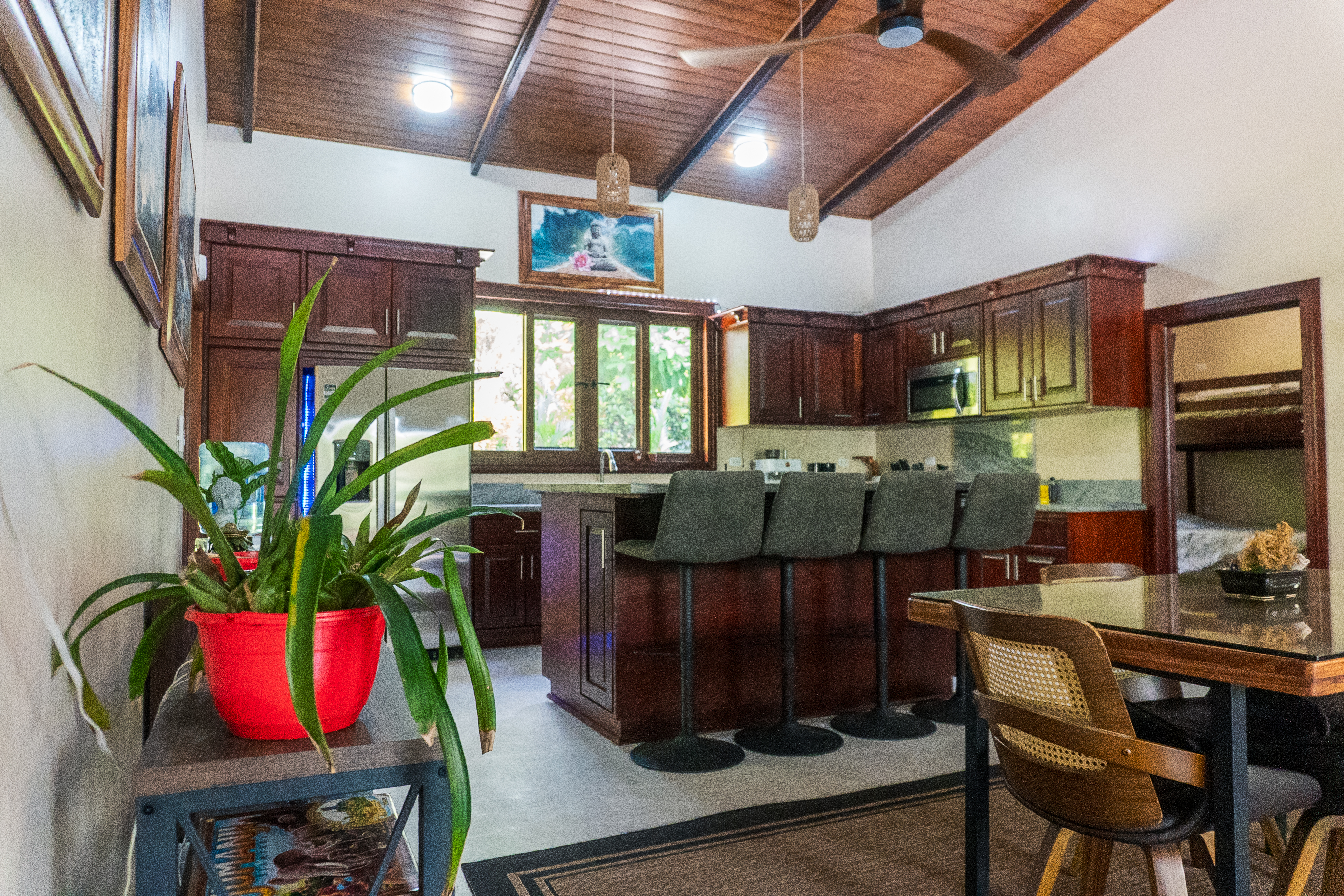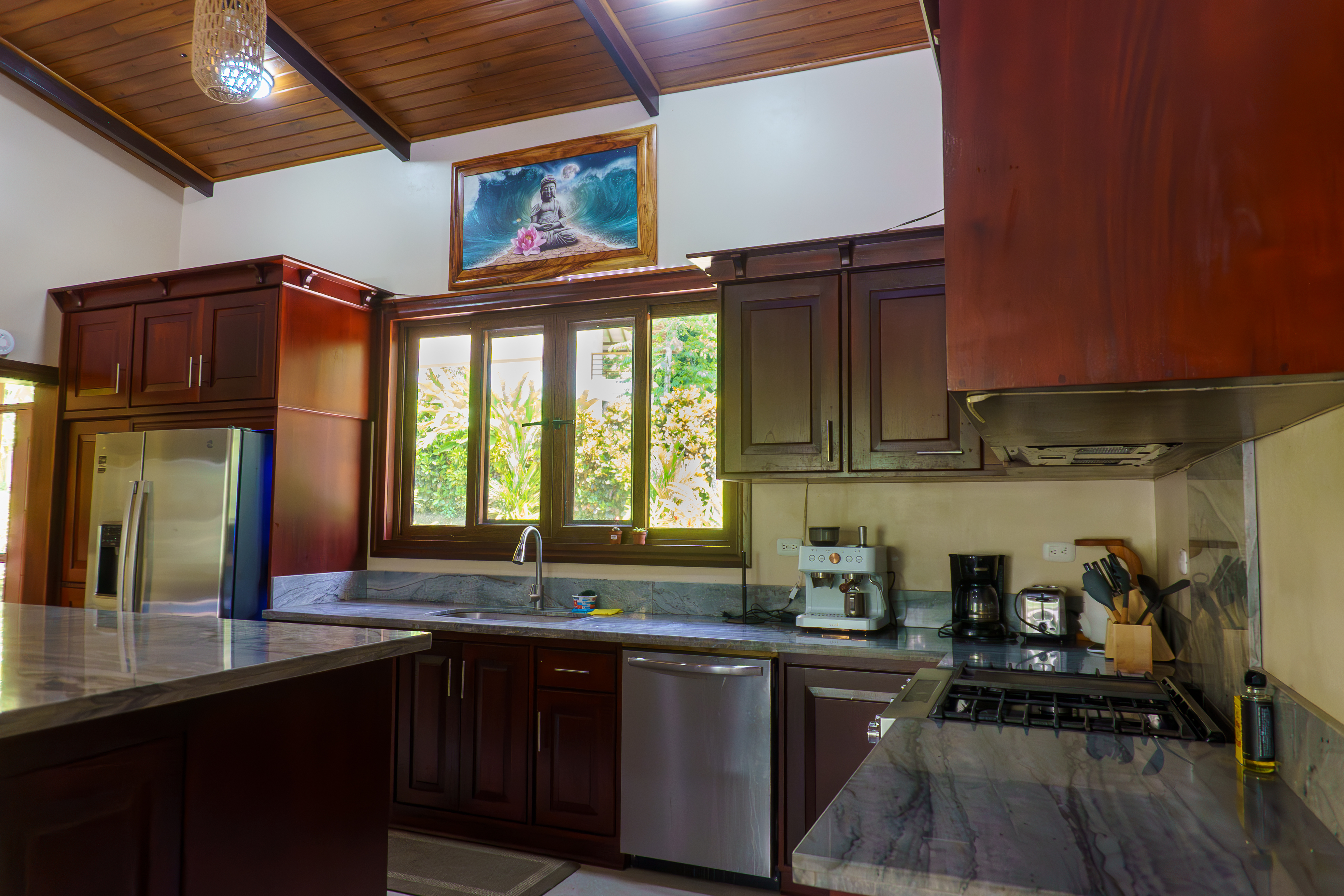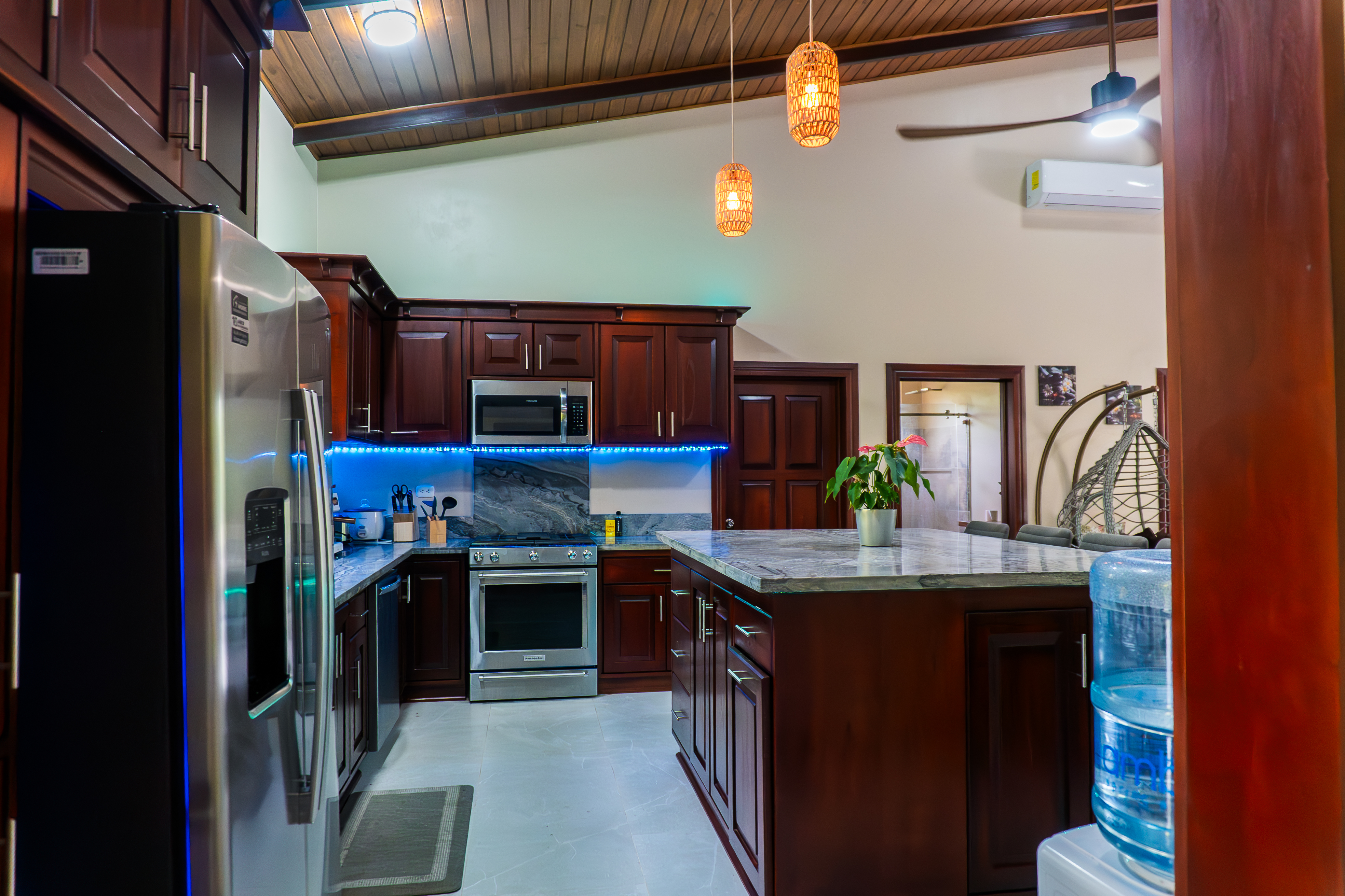 - Pavones Resort villa kitchen with dark wood cabinets and island