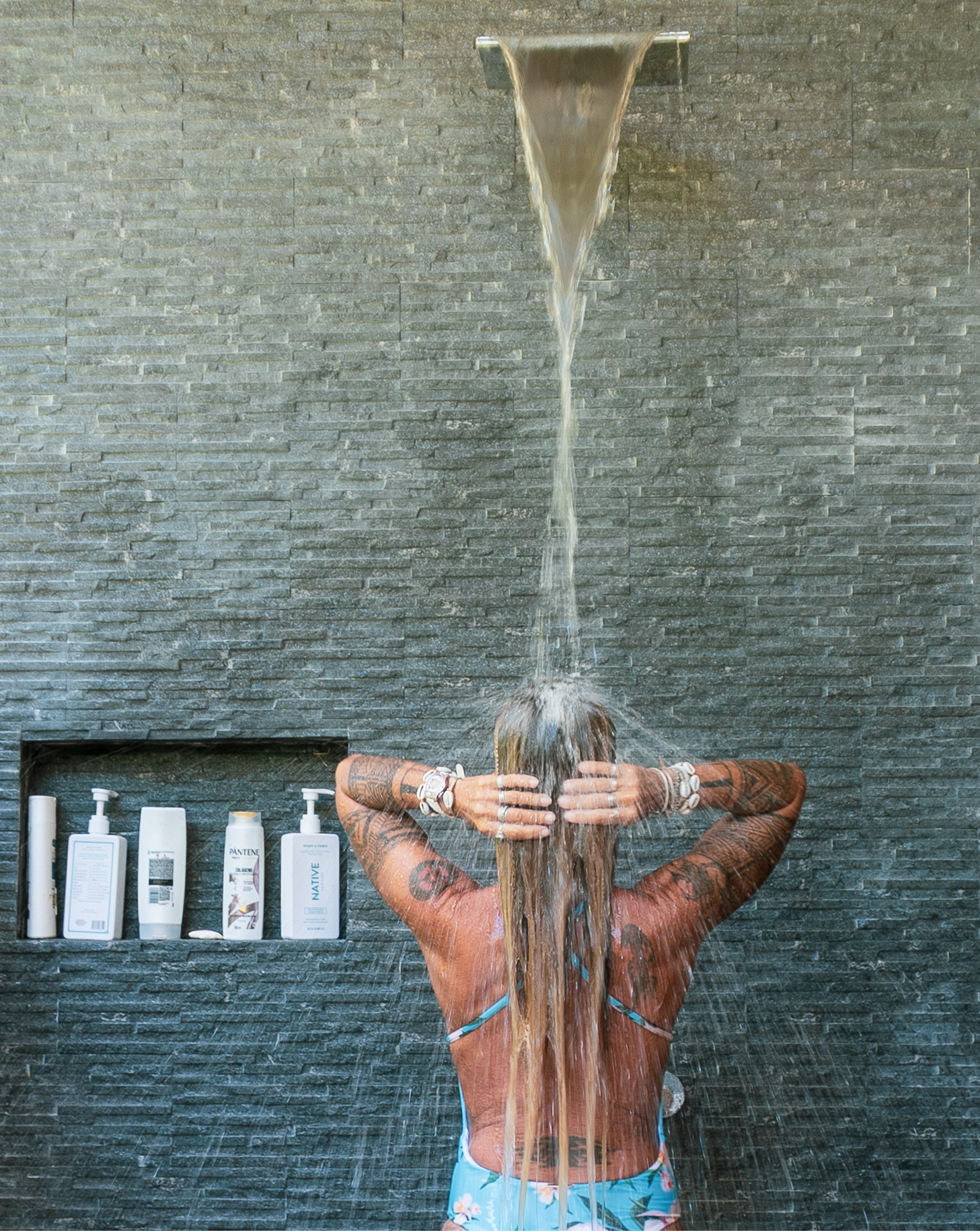 - Girl showering, patio seating at Pavones Resort