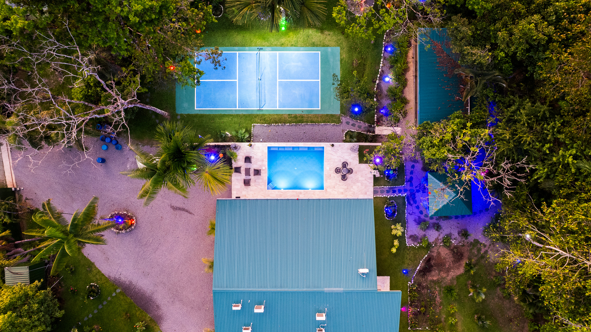 - Aerial view of Pavones Resort with pool and blue lights