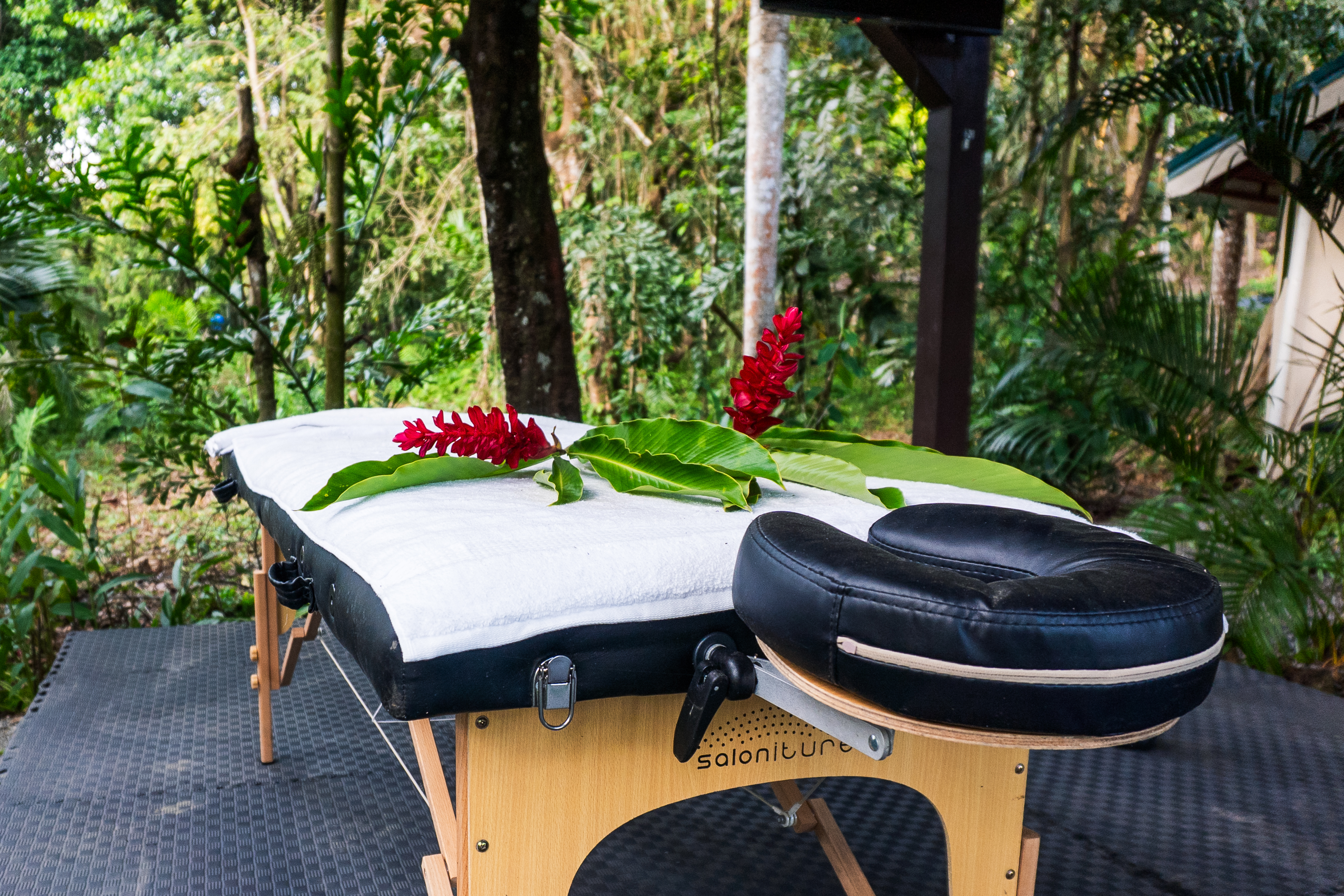 - Pavones Resort outdoor massage table with tropical flowers